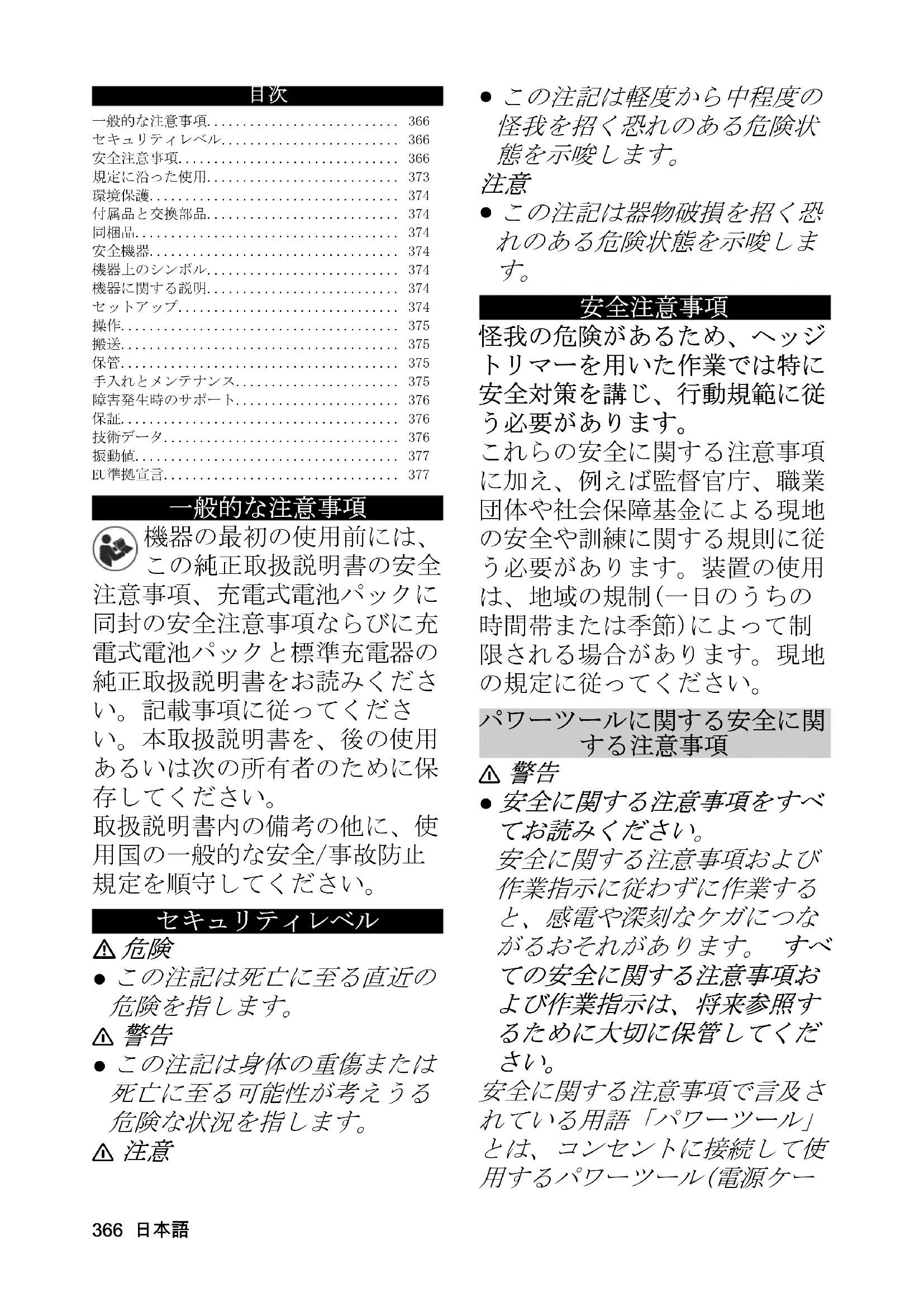 - 安全に関する注意事項で言及さ れている用語「パワーツール」 とは、コンセントに接続して使 用するパワーツール(電源ケー 一般的な注意事項 p. 366