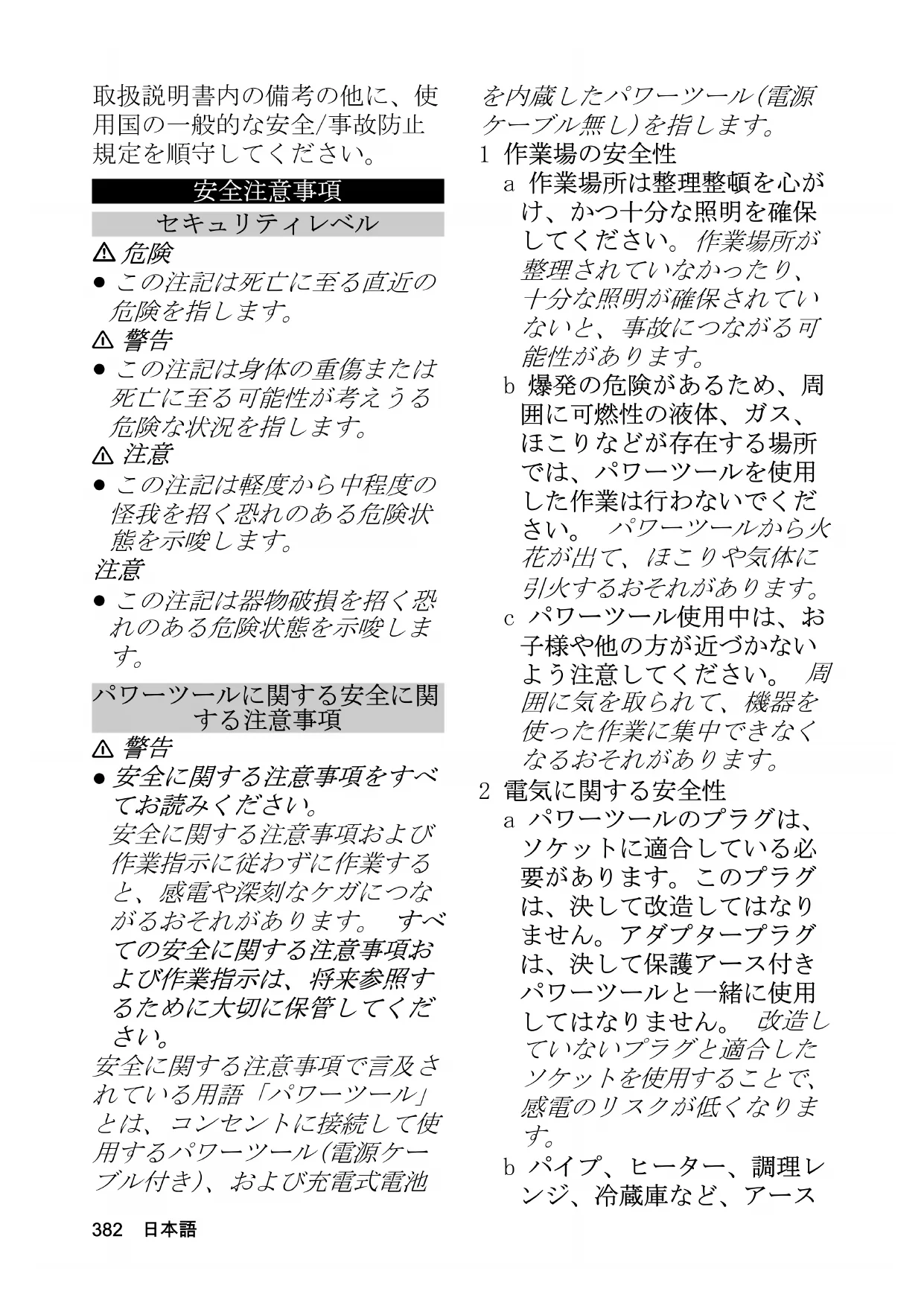 b パイプ、ヒーター、調理レ ンジ、冷蔵庫など、アース日本語 383 された表面に身体が触れな いよう注意してください。 身体が接地している場合、 感電の危険が高くなります。 c パワーツールを雨や湿気か