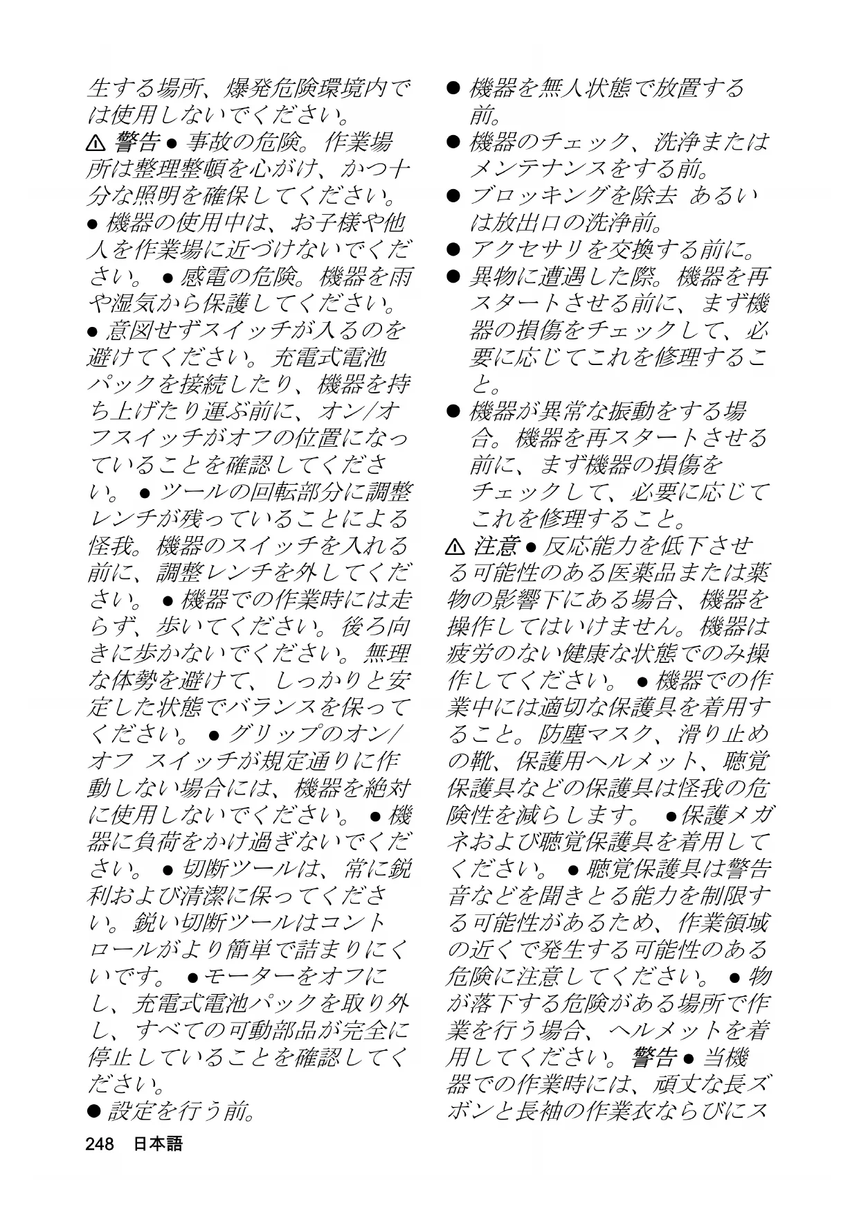 器での作業時には、頑丈な長ズ ボンと長袖の作業衣ならびにス日本語 249 リップしない長靴を着用してく ださい。裸足で作業しないこ と。サンダルあるいは短パンの 着用は禁止。緩い衣服あるいは 紐/バンド付きの衣服を避け