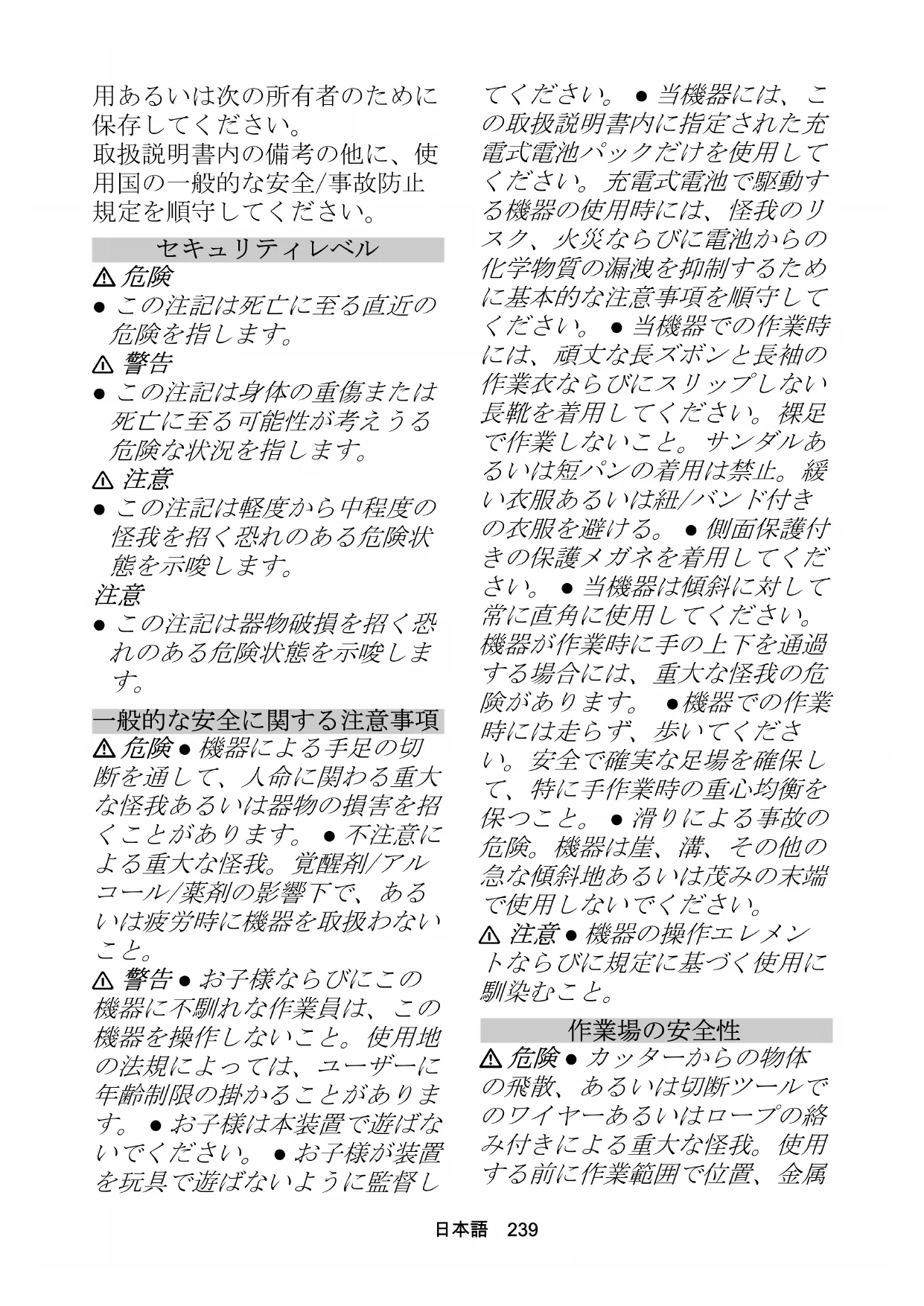 の飛散、あるいは切断ツールで のワイヤーあるいはロープの絡 み付きによる重大な怪我。使用 する前に作業範囲で位置、金属240 日本語 片、ワイヤー、骨片あるいは玩 具等の物体の有無を目視チェッ クして、必要に応じてこれらを