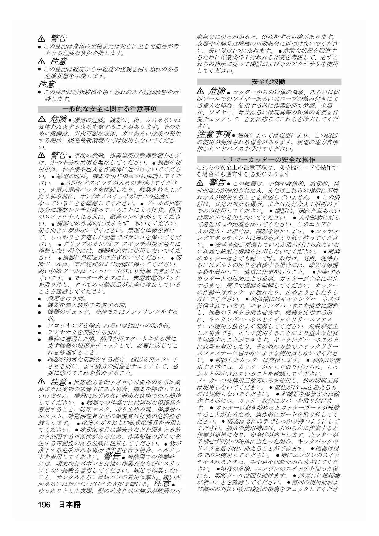 ● 機器は野外での作業用です。● 所定の飛散防止カバーを取り付けてトリマーカッターを使用する場合、本機器は密集していない低木の刈り込みに使用できます。● 所定のコード保護カバーを取り付けてコードリールを使用する場合、本機器は草や強い雑草の刈り込みに使用できます。● 機器は、芝刈機では届きにくい場所、例えば溝や斜面および伐採、での草刈りに使用できます。● 改造あるいは製造業者によって認められていない変更は、安全上の理由のため禁止されています。● 機器は、水を使用する環境や雨天時には使用しないでください。● 濡れた刈り取り対象を刈らないでください。198 日本語