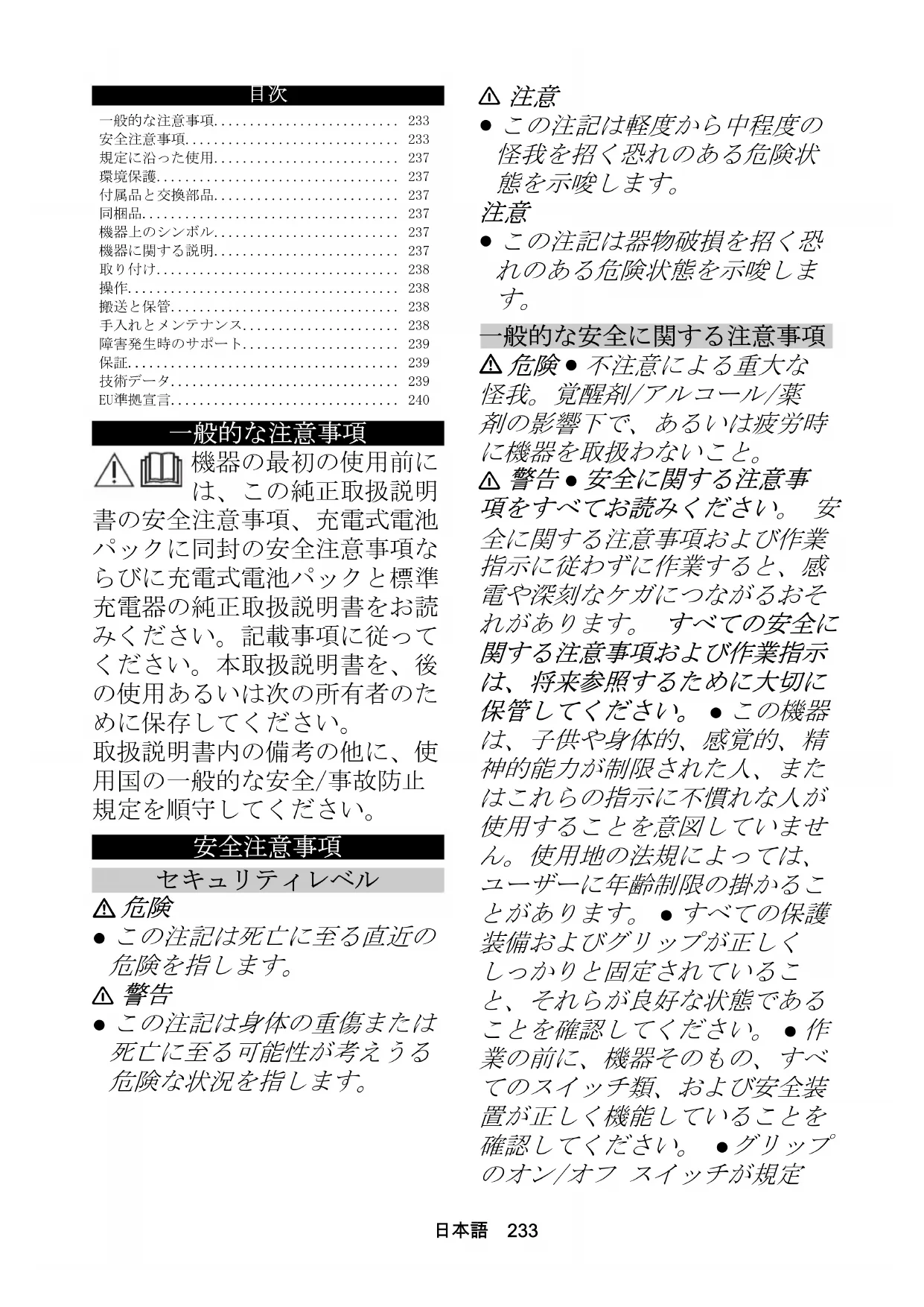 書の安全注意事項、充電式電池 パックに同封の安全注意事項な らびに充電式電池パックと標準 充電器の純正取扱説明書をお読 みください。記載事項に従って ください。本取扱説明書を、後 の使用あるいは次の所有者のた めに保存してください。 取扱説明書内の備考の他に、使 用国の一般的な安全/事故防止 規定を順守してください。