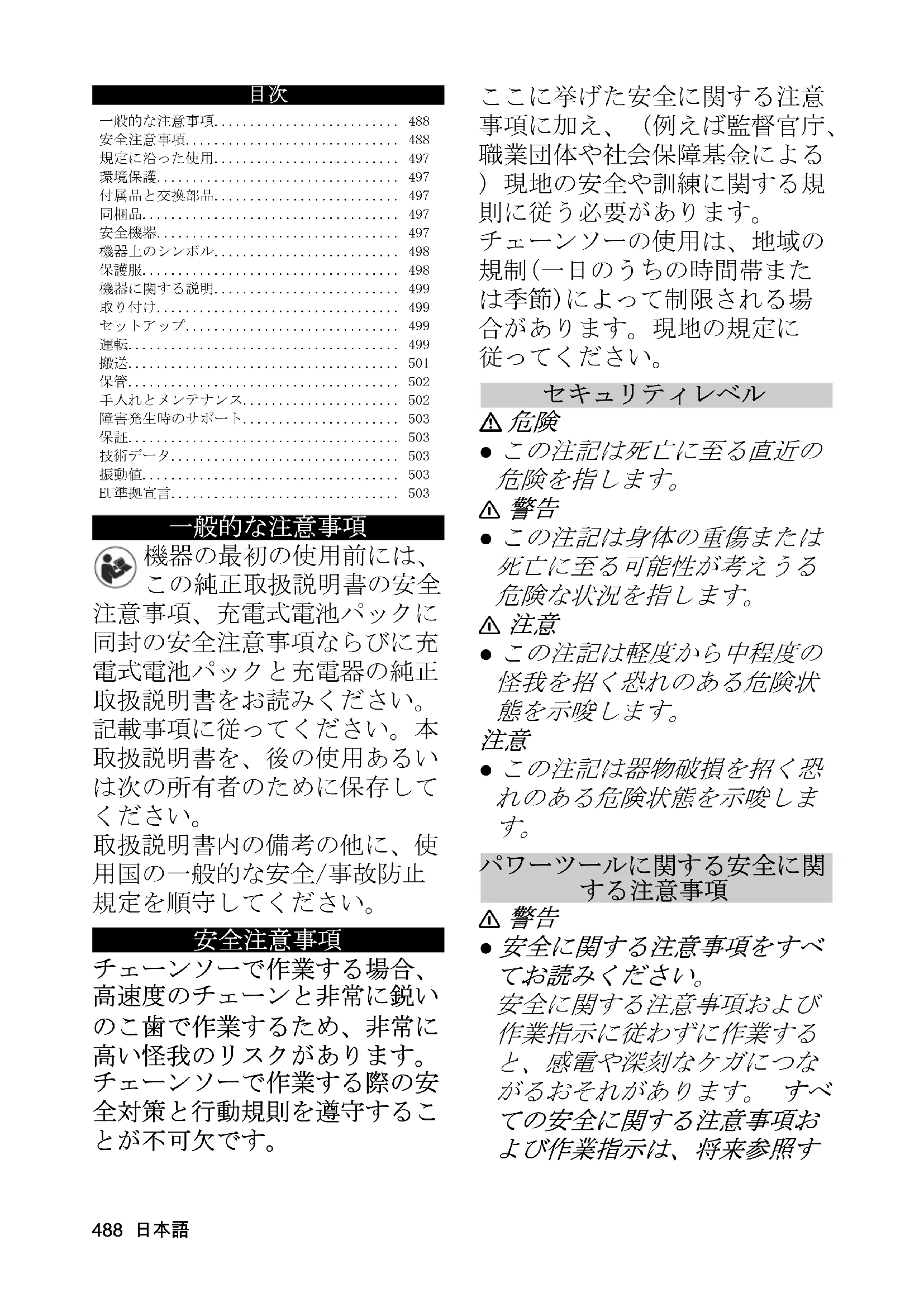 充電式電池は運搬前に機器から取り外してください。 チェーンソーは、チェーンカバーを取り付けた状態で のみ運搬してください。502 日本語