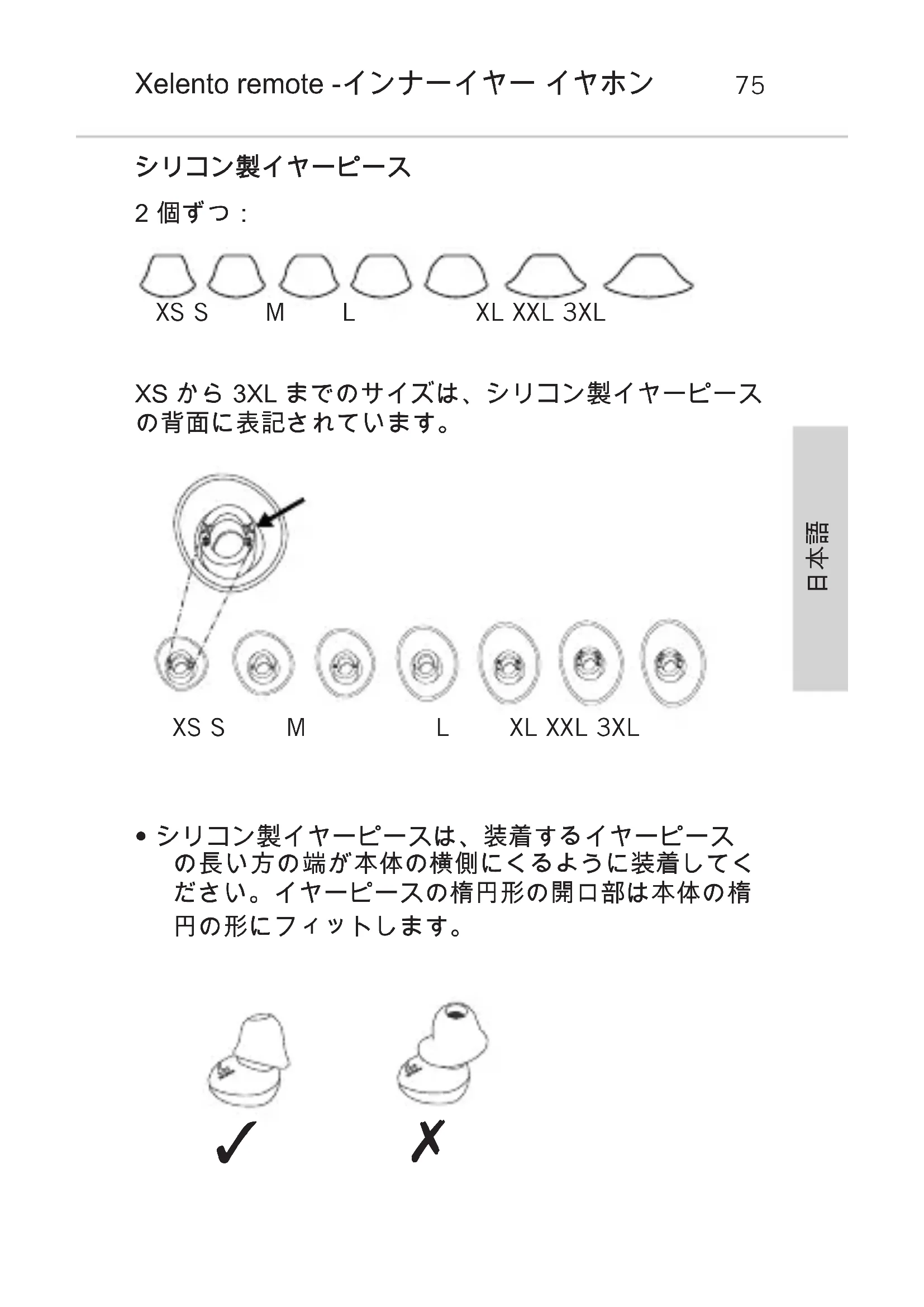 - Xelento remote には、標準 MMCX コネクタを装備し たイヤホン本体に接続可能な 2 本のケーブルが同梱 されています。ケーブルを接続 または取り外す際に は、イヤホン本体とコネクタの Xelento remote を持 つようにしてください。絶対にケーブルだけを持っ て引っぱらないでください。これを行なうと、ケー ブルまたはイヤホンを破損することがあります!日本語 Xelento remote -インナーイヤー イヤホン