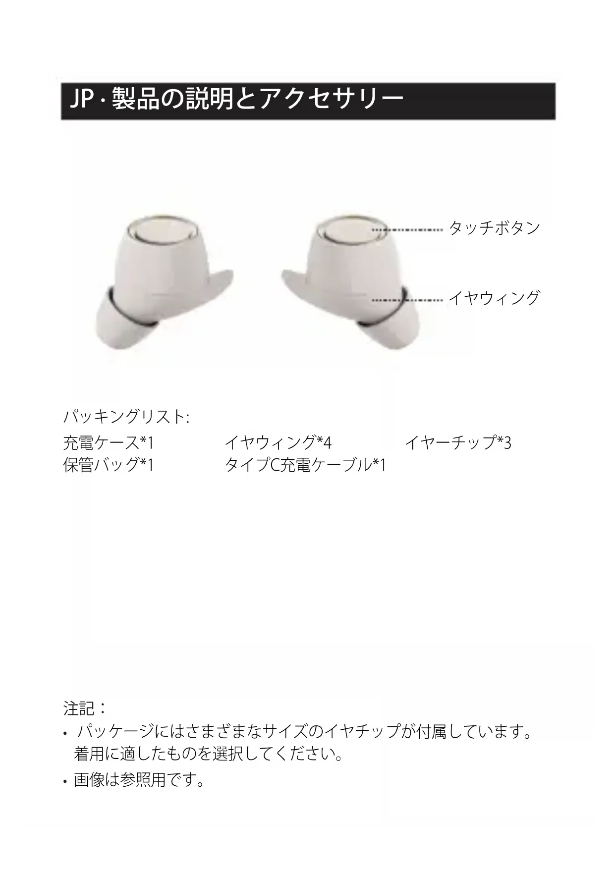 - パッケージにはさまざまなサイズのイヤチップが付属しています。 着用に適したものを選択してください。