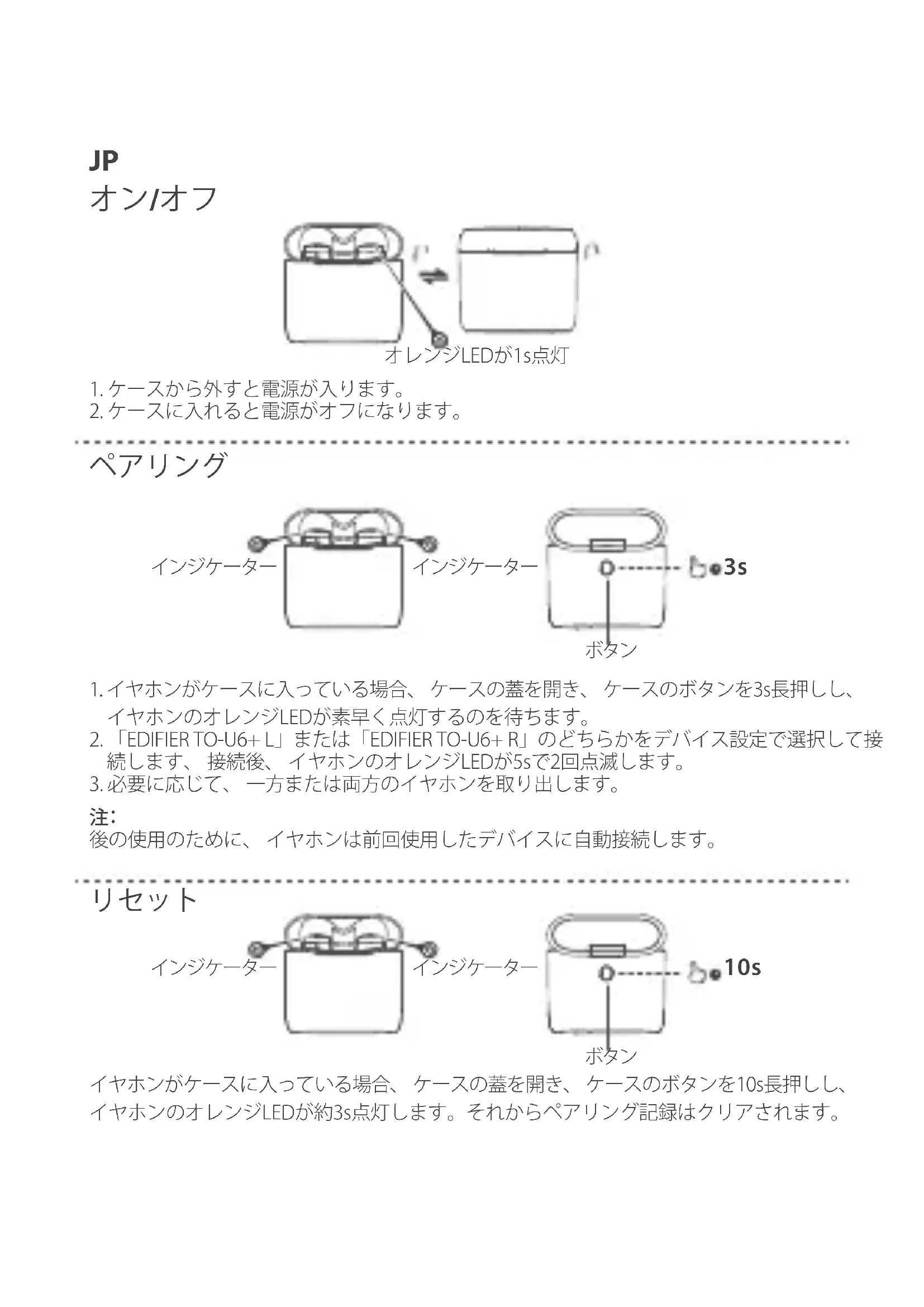イヤホンがケースに入っている場合、ケースの蓋を開き、ケースのボタンを10s長押しし、 イヤホンのオレンジLEDが約3s点灯します。それからペアリング記録はクリアされます。 オレンジLEDが1s点灯