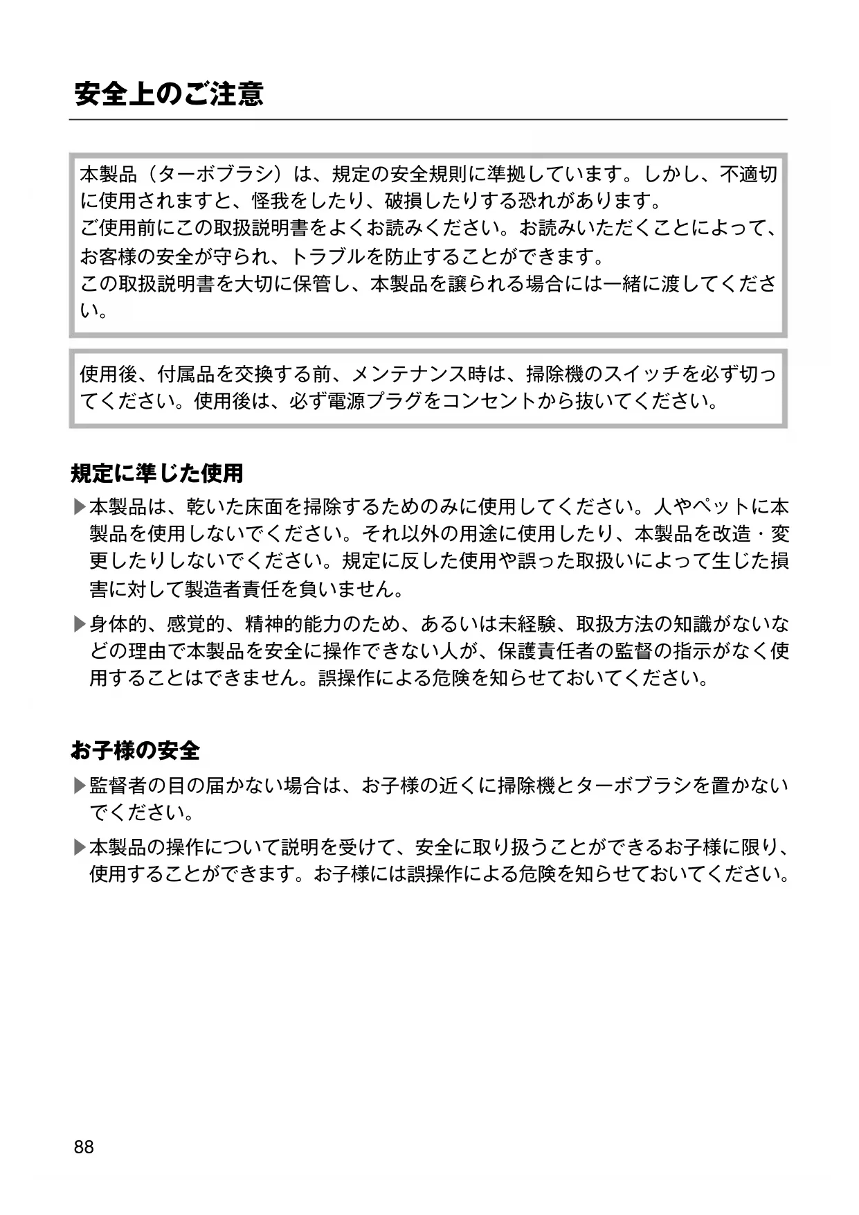 88▶監督者がいない状態で、お子様だけで、掃除機とターボブラシの掃除やメンテナ ンスはさせないでください。 ▶掃除機やターボブラシのそばにいるお子様から目を離さないように十分ご注意く ださい。掃除機やターボブラシで絶対遊ばせないでください。