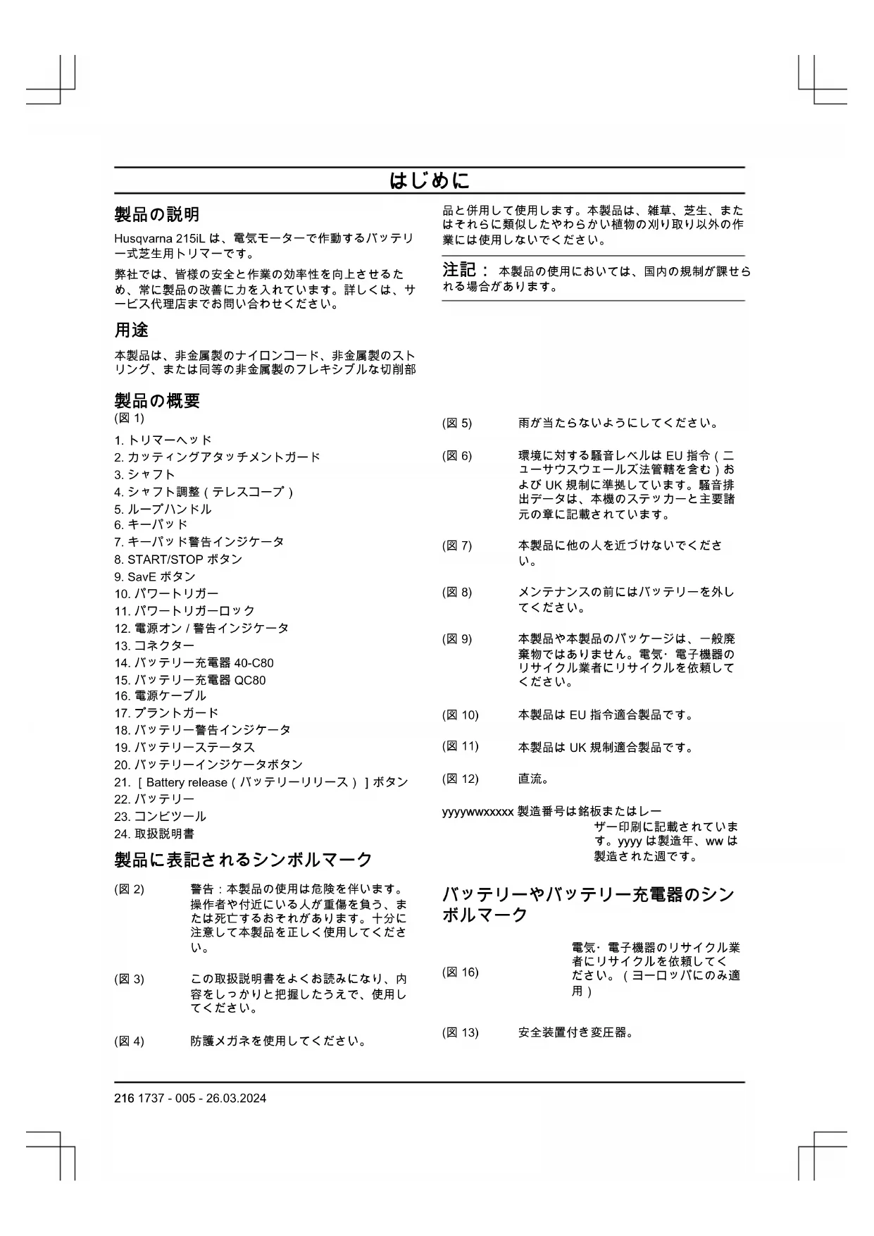 1737 - 005 - 26.03.2024 229適合宣言 EU 適合宣言 ハスクバーナ社(Husqvarna AB, SE-561 82 Huskvarna, Sweden、電話番号:+46-36-146500)は、 単独責任のもとで、以下の製品の適合を宣言します。 名称 バッテリー式芝生用トリマー ブランド Husqvarna タイプ/モデル 215iL ID 2024 年以降の製造番号 が以下の EU 指令および規制を完全に順守し、
