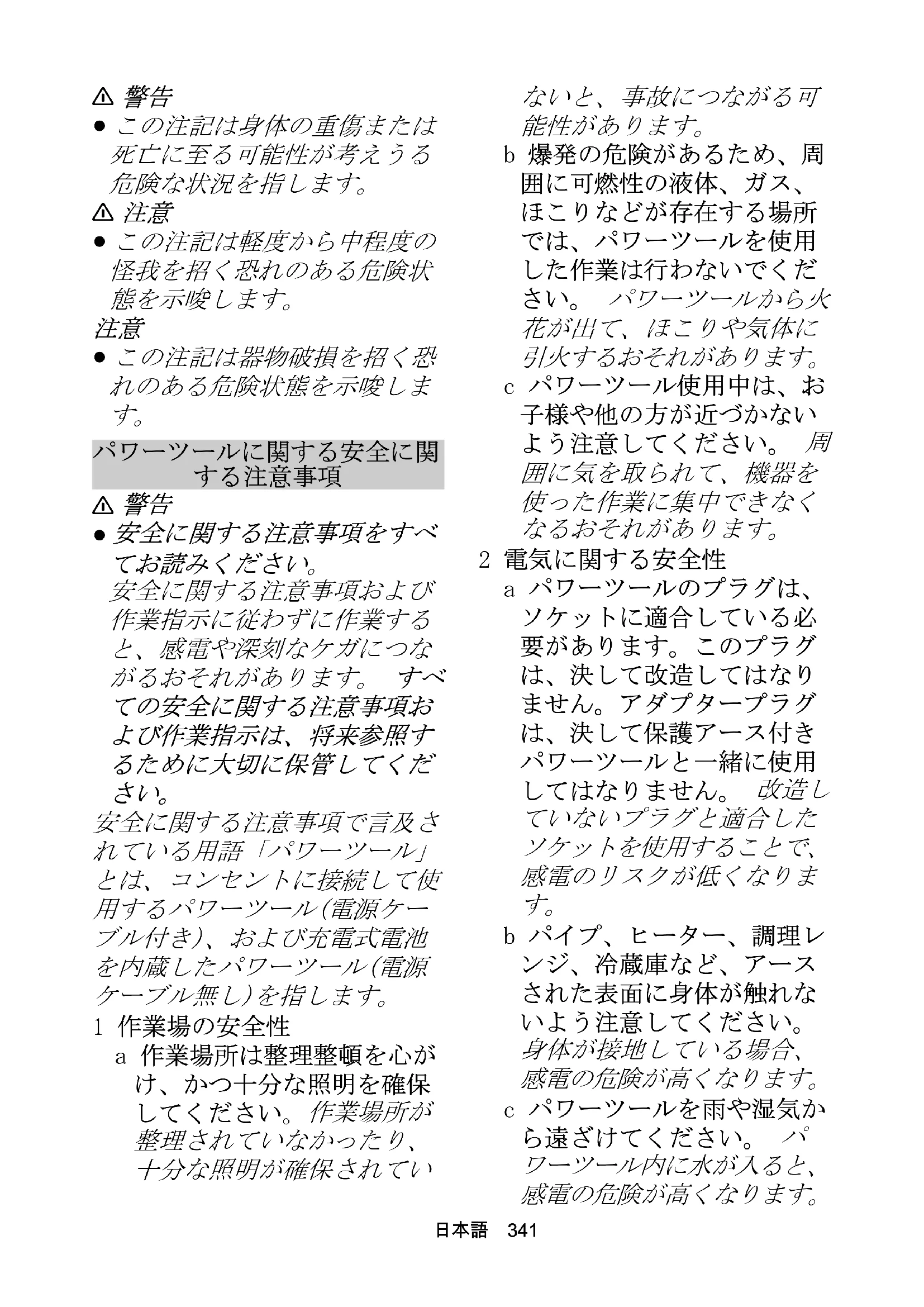 以外の方法でパワーツール を使用すると、危険な状況344 日本語 を発生させる原因となりま