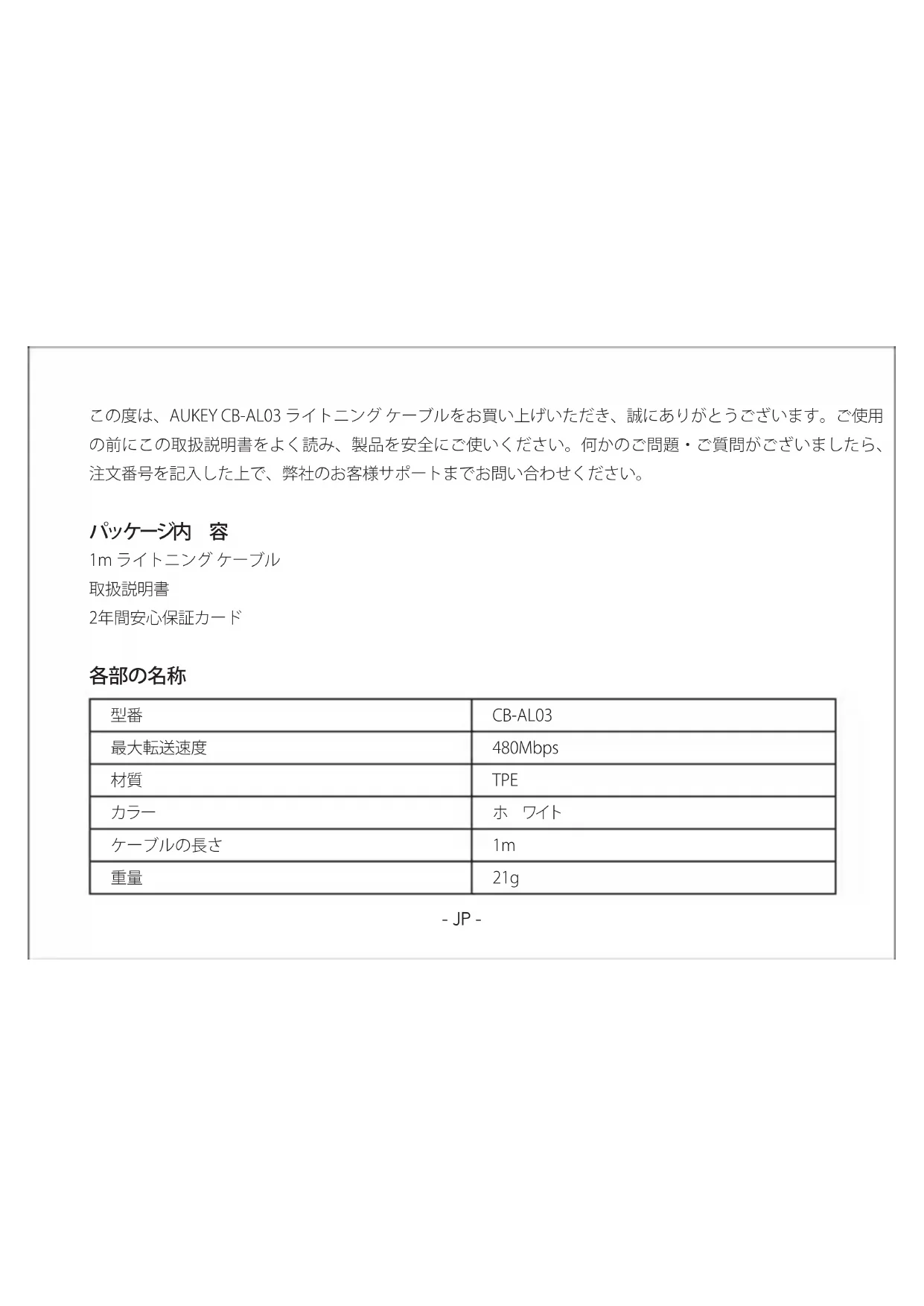 21g- JP - 保証とアフターサービス 製品について、何のご問題・ご質問などがございましたら、ご注文番号を記入した上で、下記のメールアドレ スまでお問い合わせください。最も早い営業日にご返信を差し上げます。 Eメール:support.jp@aukey.com *当社は、AUKEY公式ショップまたは当社が認める小売業者から購入された製品のみに対して、アフターサービスと製品保 証を提供しております。他の小売業者から購入された製品の交換、返品、返金に関しましては購入先へお問い合わせ下さい。Model: CB-AL03 AUKEY International Ltd. www.aukey.com | support@aukey.com No.102, Building P09, Electronics Trade Center Huanan City, Pinghu Town, Longgang District Shenzhen, Guangdong, 518111, CN