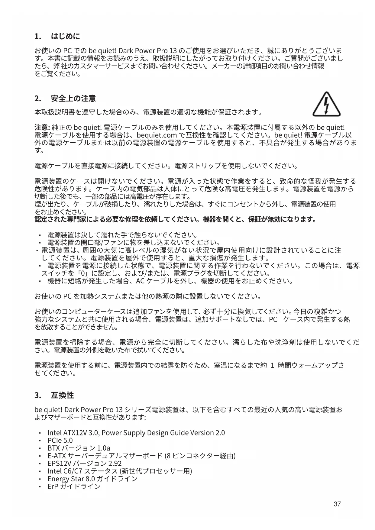 本取扱説明書を遵守した場合のみ、電源装置の適切な機能が保証されます。 注意:純正の be quiet! 電源ケーブルのみを使用してください。本電源装置に付属する以外の be quiet! 電源ケーブルを使用する場合は、bequiet.com で互換性を確認してください。be quiet! 電源ケーブル以 外の電源ケーブルまたは以前の電源装置の電源ケーブルを使用すると、不具合が発生する場合がありま