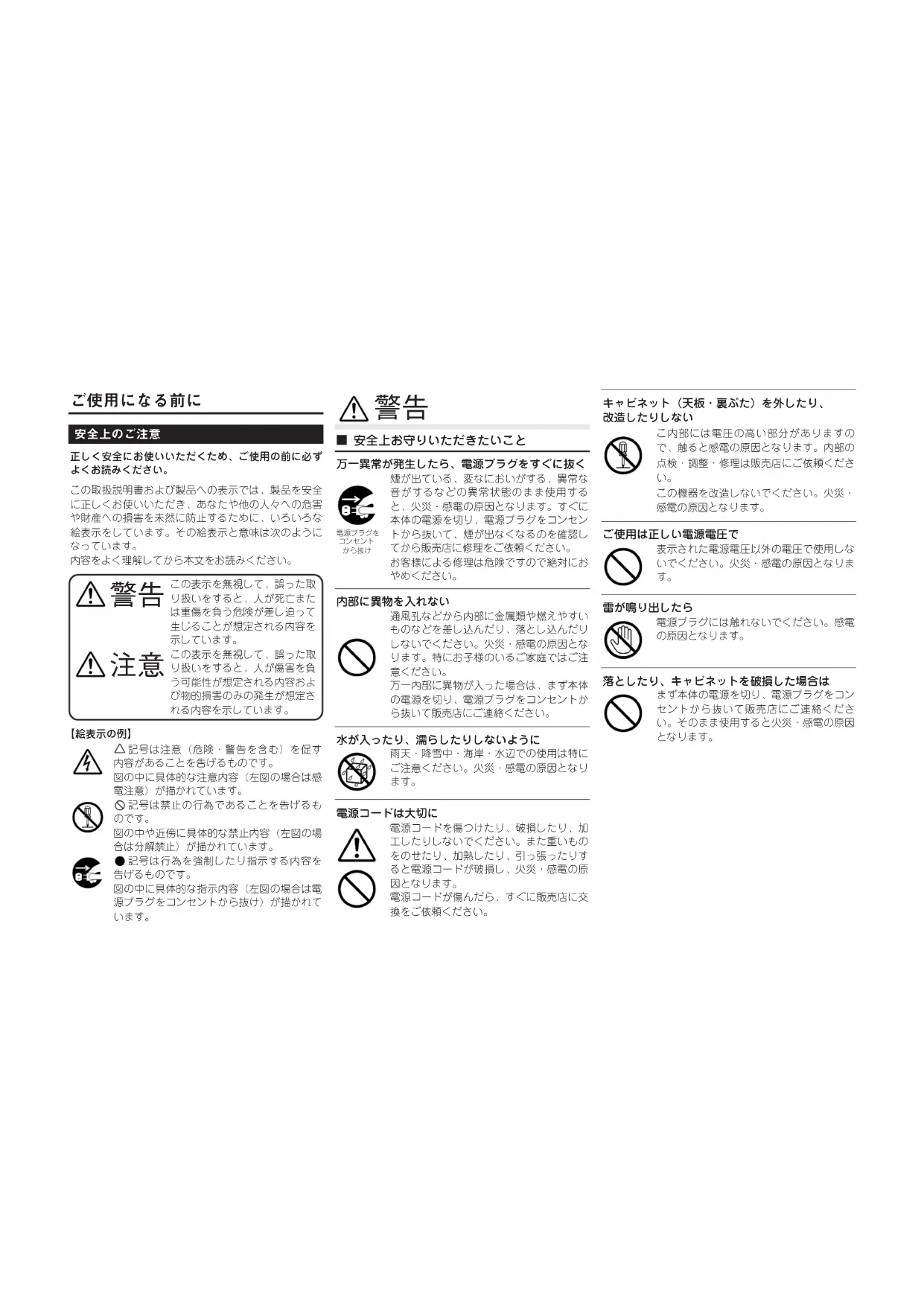 落としたり、キャビネットを破損した場合は まず本体の電源を切り、電源プラグをコン セントから抜いて販売店にご連絡くださ い。そのまま使用すると火災・感電の原因 となります。2 安全上お守りいただきたいこと