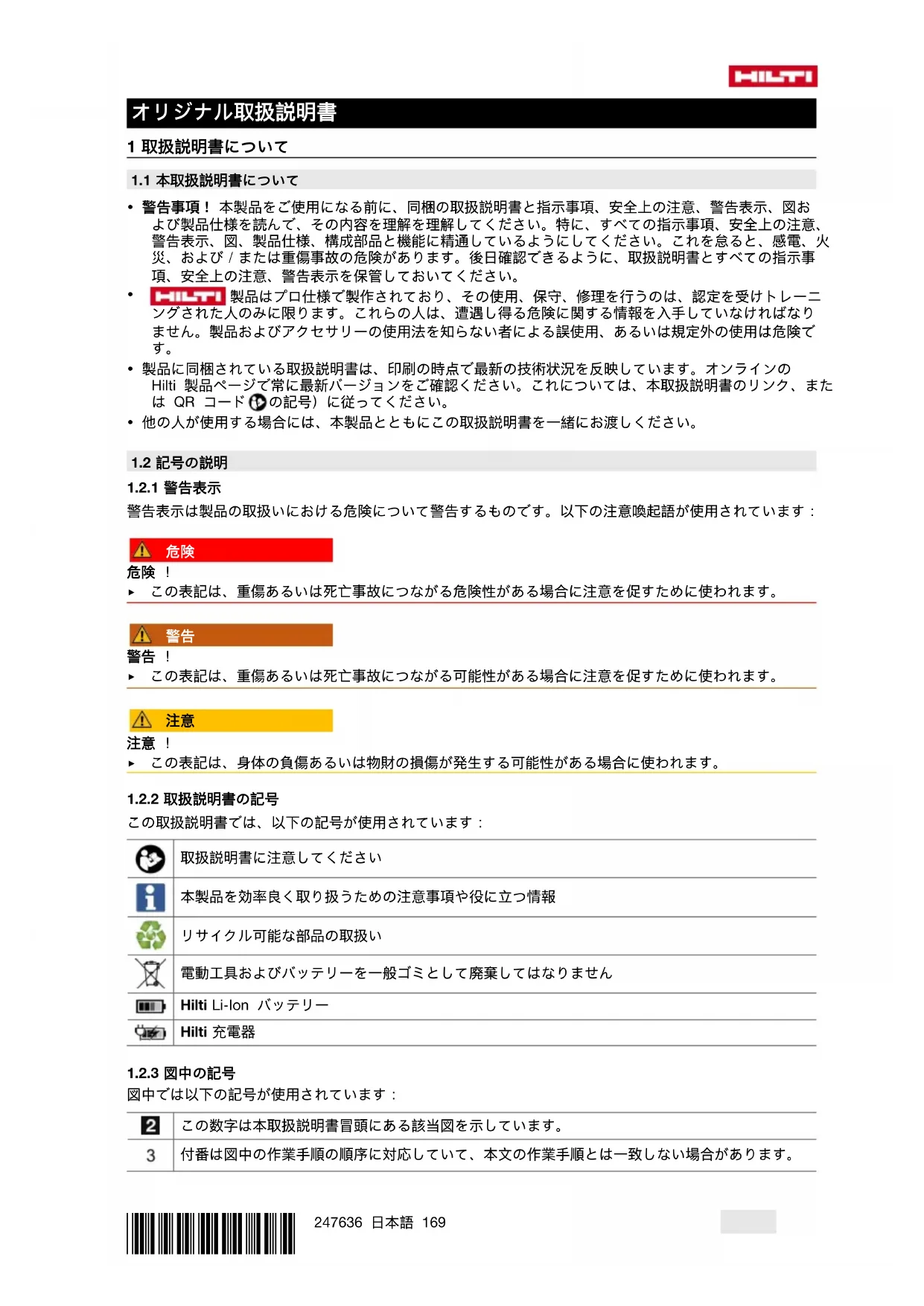 この取扱説明書では、以下の記号が使用されています: 取扱説明書に注意してください 本製品を効率良く取り扱うための注意事項や役に立つ情報 リサイクル可能な部品の取扱い 電動工具およびバッテリーを一般ゴミとして廃棄してはなりません Hilti Li-Ion バッテリー Hilti 充電器