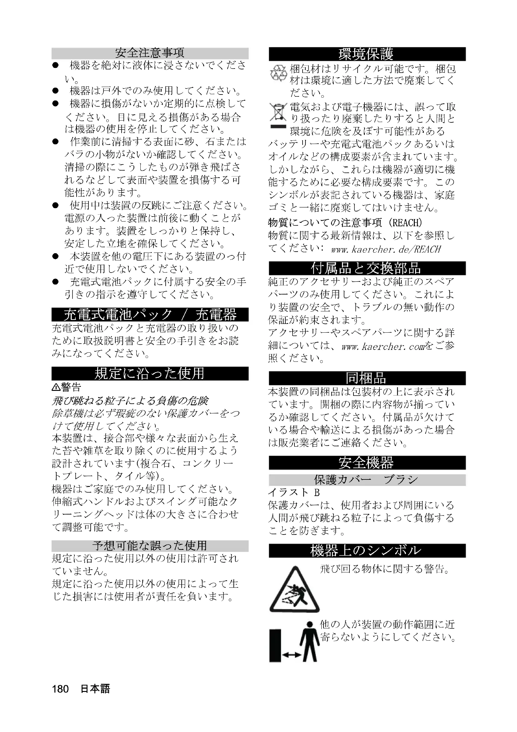 飛び回る物体に関する警告。 他の人が装置の動作範囲に近 寄らないようにしてください。日本語 181