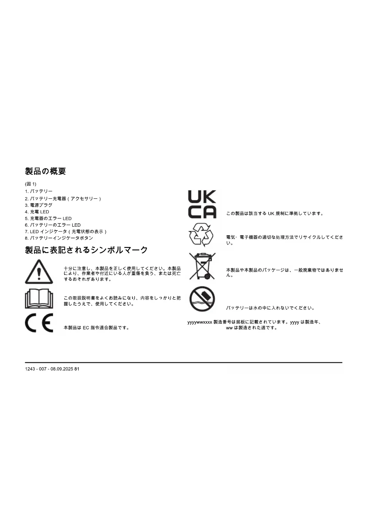 バッテリーは水の中に入れないでください。 yyyywwxxxx 製造番号は銘板に記載されています。yyyy は製造年、 ww は製造された週です。 1243 - 007 - 08.09.2025 81注記: 本製品に付いている他のシンボル/銘板は、一部の商業地域に 向けた認定条件を示します。
