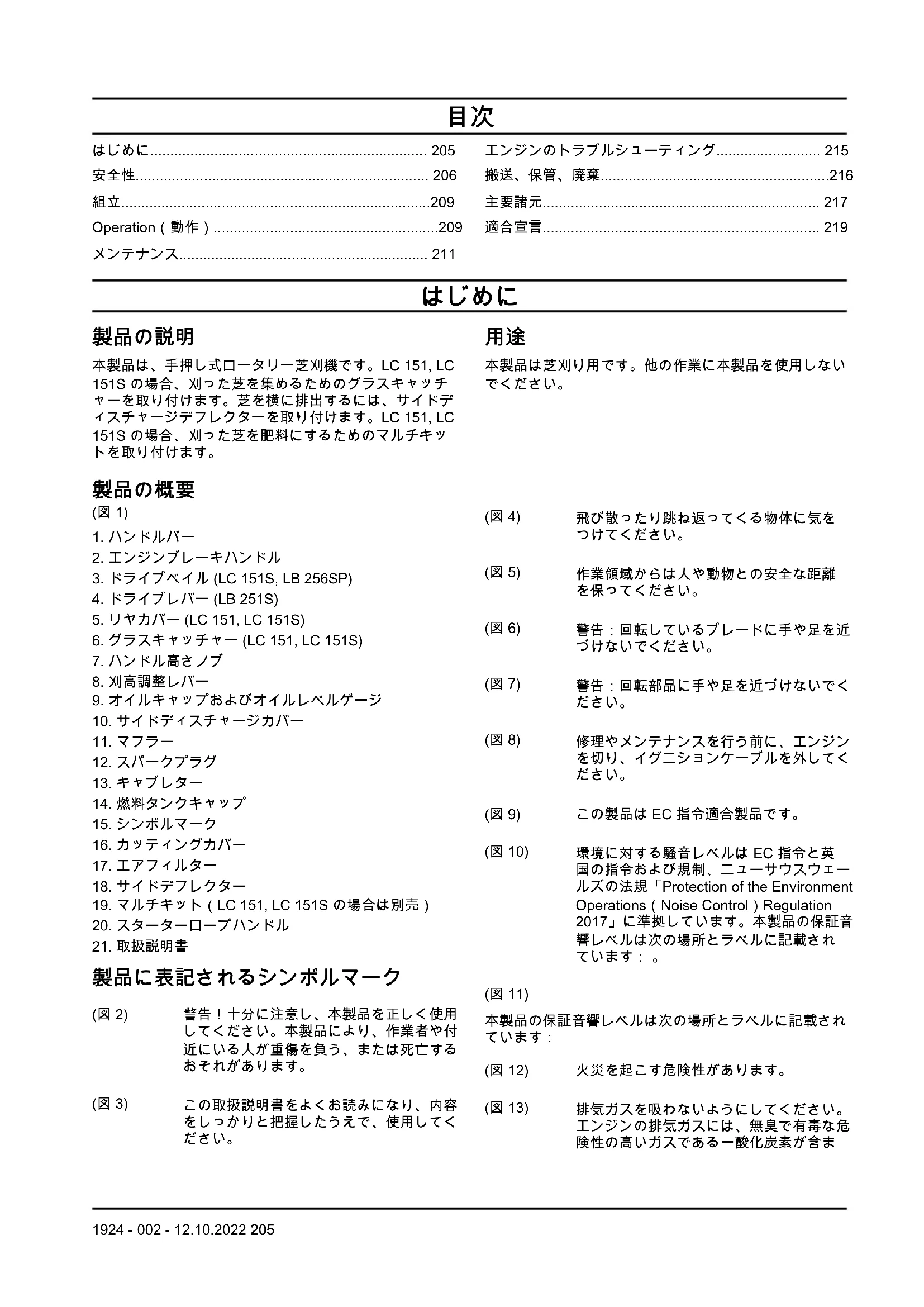 本製品は、手押し式ロータリー芝刈機です。LC 151, LC 151S の場合、刈った芝を集めるためのグラスキャッチ ャーを取り付けます。芝を横に排出するには、サイドデ ィスチャージデフレクターを取り付けます。LC 151, LC 151S の場合、刈った芝を肥料にするためのマルチキッ