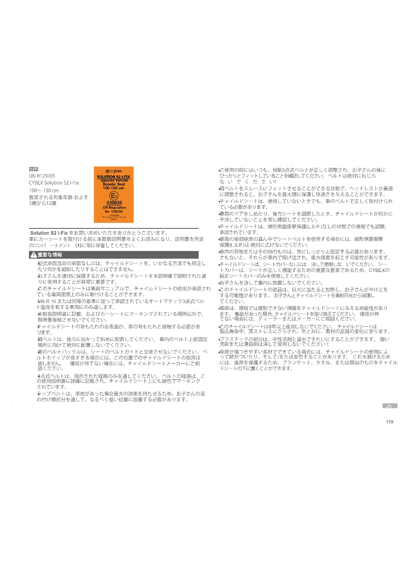 UNR129/03 CYBEXSolutionS2i-Fix 100~150cm 推奨される対象年齢およそ 3歳から12歳