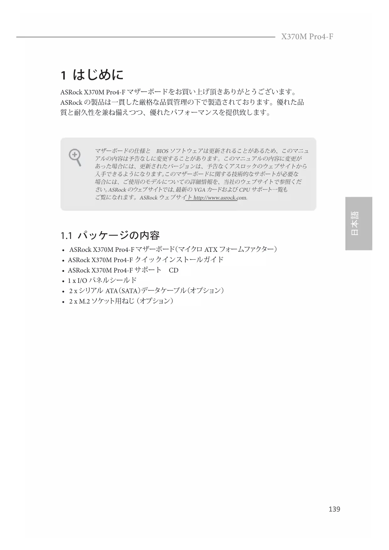 - 2 x M.2 ソケット用ねじ (オプション) マザーボードの仕様と BIOS ソフトウェアは更新されることがあるため、このマニュアルの内容は予告なしに変更することがあります。このマニュアルの内容に変更があった場合には、更新されたバージョンは、予告なくアスロックのウェブサイトから入手できるようになります。このマザーボードに関する技術的なサポートが必要な場合には、ご使用のモデルについての詳細情報を、当社のウェブサイトで参照くだ さい。ASRock のウェブサイトでは、最新の VGA カードおよび CPU サポート一覧も ご覧になれます。ASRock ウェブサイト http://www.asrock.com.140