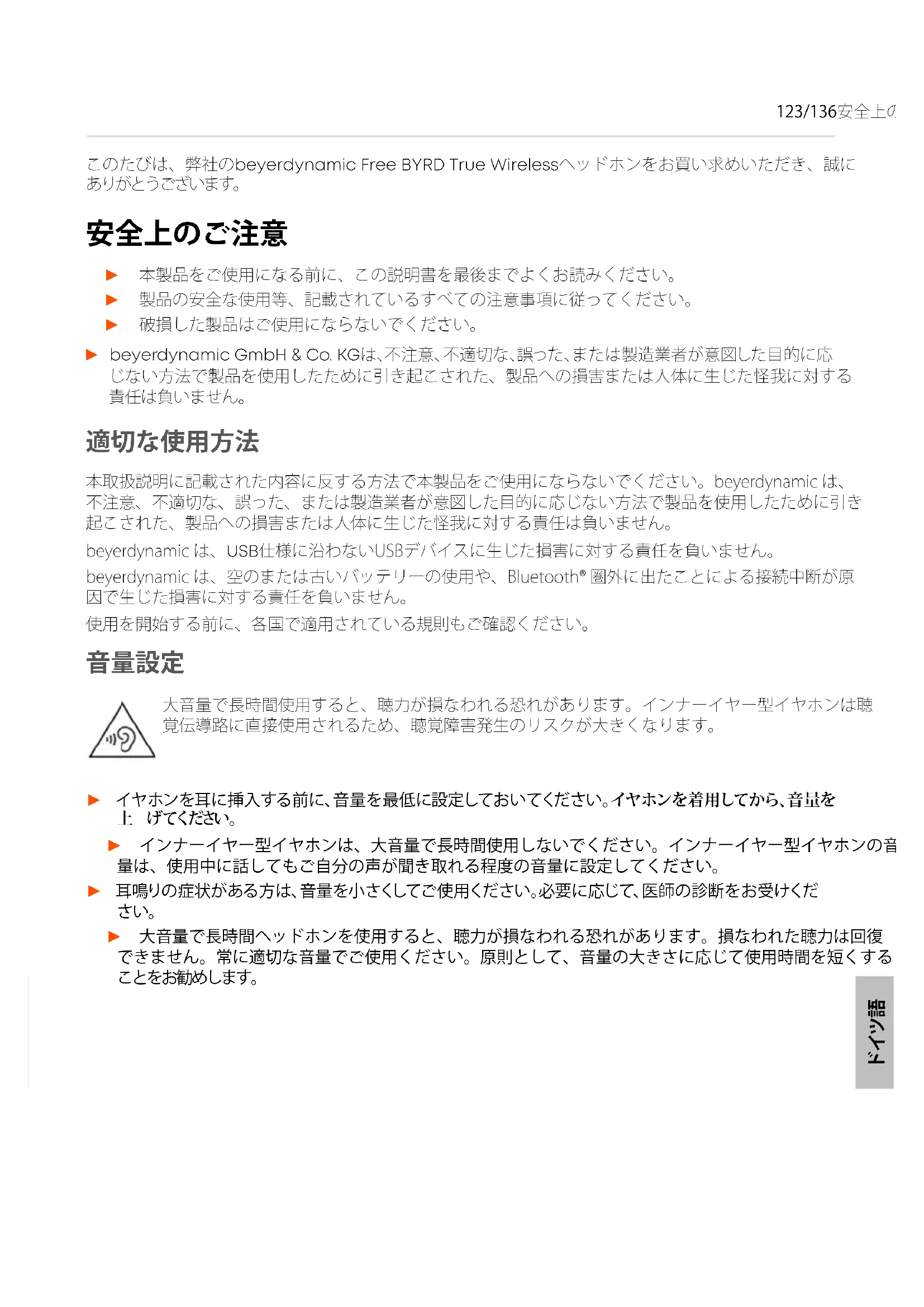 123/136安全上のご注意 このたびは、弊社のbeyerdynamic Free BYRD True Wirelessヘッドホンをお買い求めいただき、誠に ありがとうございます。