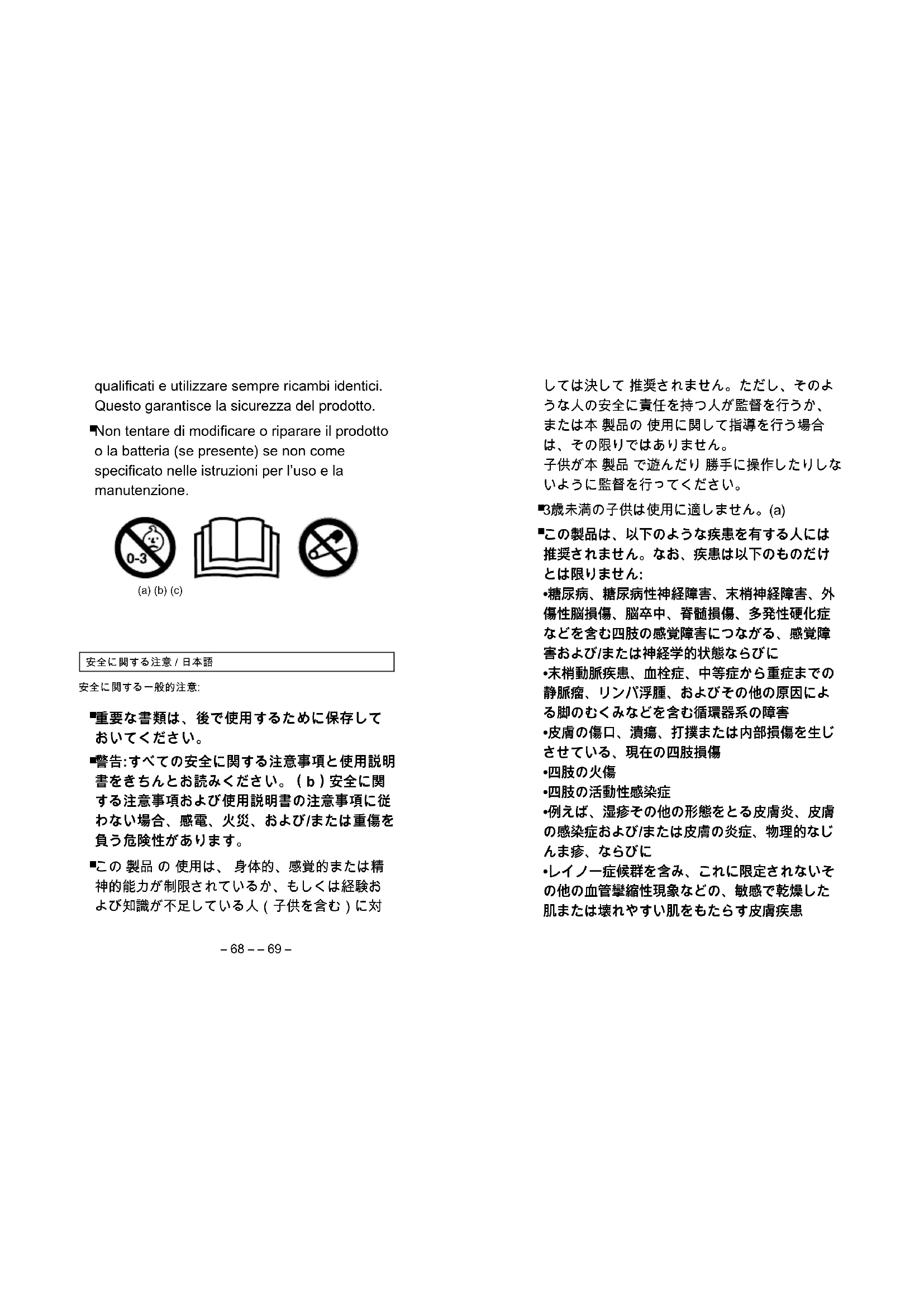 上記の疾患のいずれか1つ、またはその他の記載 されていない疾患に罹患している場合、現在ま たは継続的に薬を服用している場合、および/ま たは熱や冷たさを適切に知覚できない場合(例 えば、障害のある人など)は、本製品を使用す る前に医師に相談してください!