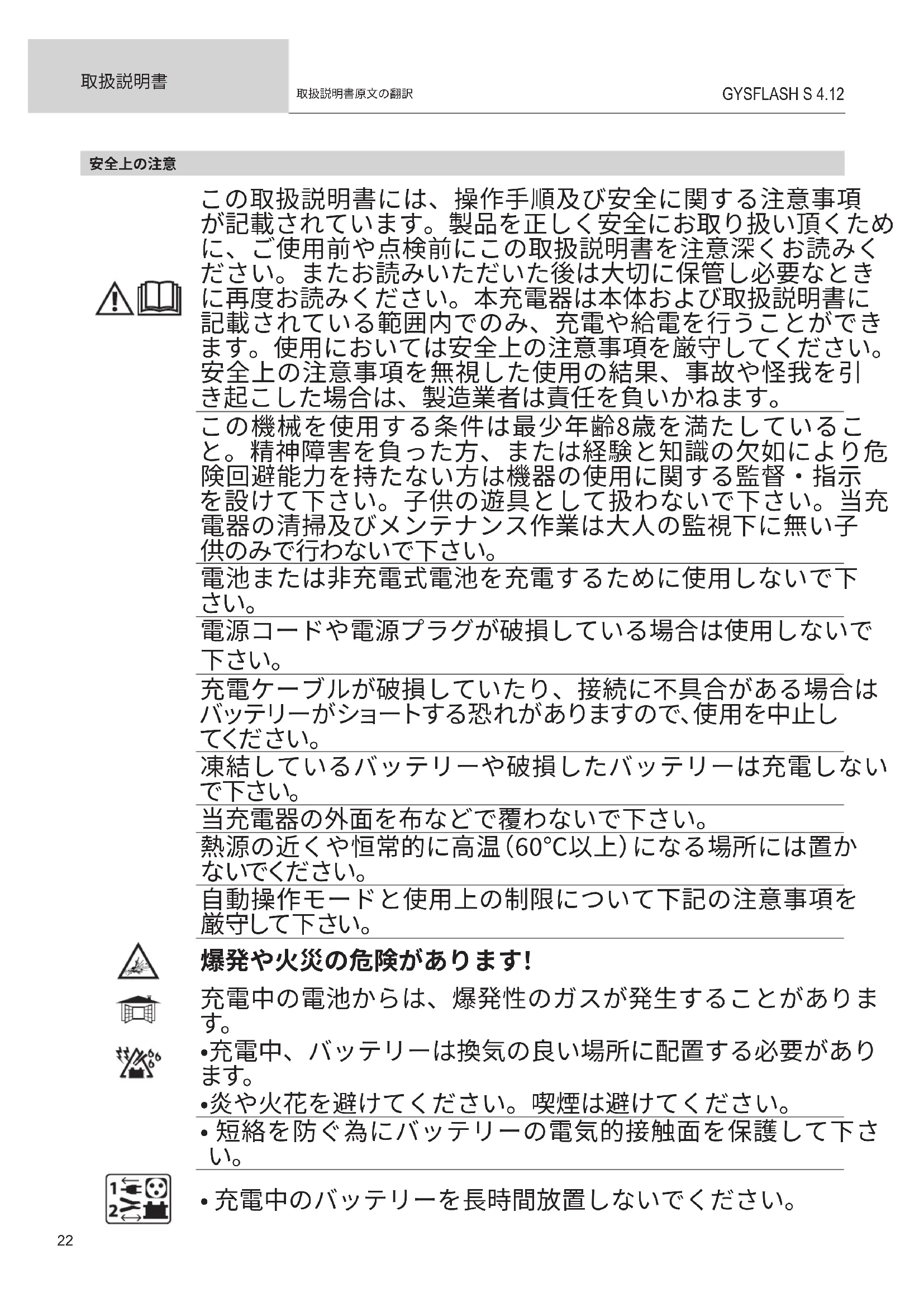 この取扱説明書には、操作手順及び安全に関する注意事項 が記載されています。製品を正しく安全にお取り扱い頂くため に、ご使用前や点検前にこの取扱説明書を注意深くお読みく ださい。またお読みいただいた後は大切に保管し必要なとき に再度お読みください。本充電器は本体および取扱説明書に 記載されている範囲内でのみ、充電や給電を行うことができ ます。使用においては安全上の注意事項を厳守してください。 安全上の注意事項を無視した使用の結果、事故や怪我を引 き起こした場合は、製造業者は責任を負いかねます。 この機械を使用する条件は最少年齢8歳を満たしているこ と。精神障害を負った方、または経験と知識の欠如により危 険回避能力を持たない方は機器の使用に関する監督・指示 を設けて下さい。子供の遊具として扱わないで下さい。当充 電器の清掃及びメンテナンス作業は大人の監視下に無い子 供のみで行わないで下さい。 電池または非充電式電池を充電するために使用しないで下