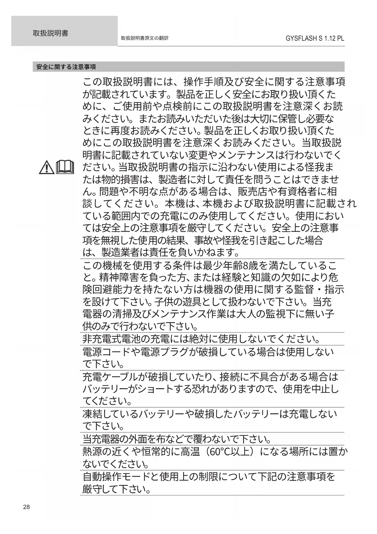 - 环境造成的故障 (污染、生锈、粉尘)。 如发生故障,请将设备退回至经销商处,并附上: - 购买凭证 (收据,发票...) - 故障说明。安全に関する注意事項 この取扱説明書には、操作手順及び安全に関する注意事項 が記載されています。製品を正しく安全にお取り扱い頂くた めに、ご使用前や点検前にこの取扱説明書を注意深くお読 みください。またお読みいただいた後は大切に保管し必要な と き に 再 度 お 読 み く だ さ い 。製 品 を 正 しくお 取 り 扱 い 頂 く た めにこの取扱説明書を注意深くお読みください。当取扱説 明書に記載されていない変更やメンテナンスは行わないでく だ さ い 。当 取 扱 説 明 書 の 指 示 に 沿 わ な い 使 用 に よ る 怪 我 ま たは物的損害は、製造者に対して責任を問うことはできませ ん。問題や不明な点がある場合は、販売店や有資格者に相 談してください。本機は、本機および取扱説明書に記載され ている範囲内での充電にのみ使用してください。使用におい ては安全上の注意事項を厳守してください。安全上の注意事 項を無視した使用の結果、事故や怪我を引き起こした場合 は、製造業者は責任を負いかねます。 この機械を使用する条件は最少年齢8歳を満たしているこ と 。精 神 障 害 を 負 っ た 方 、ま た は 経 験 と 知 識 の 欠 如 に よ り 危 険回避能力を持たない方は機器の使用に関する監督・指示 を設けて下さい。子供の遊具として扱わないで下さい。当充 電器の清掃及びメンテナンス作業は大 人の監視下に無い子 供のみで行わないで下さい。 非充電式電池の充電には絶対に使用しないでください。 電源コードや電源プラグが破損している場合は使用しない
