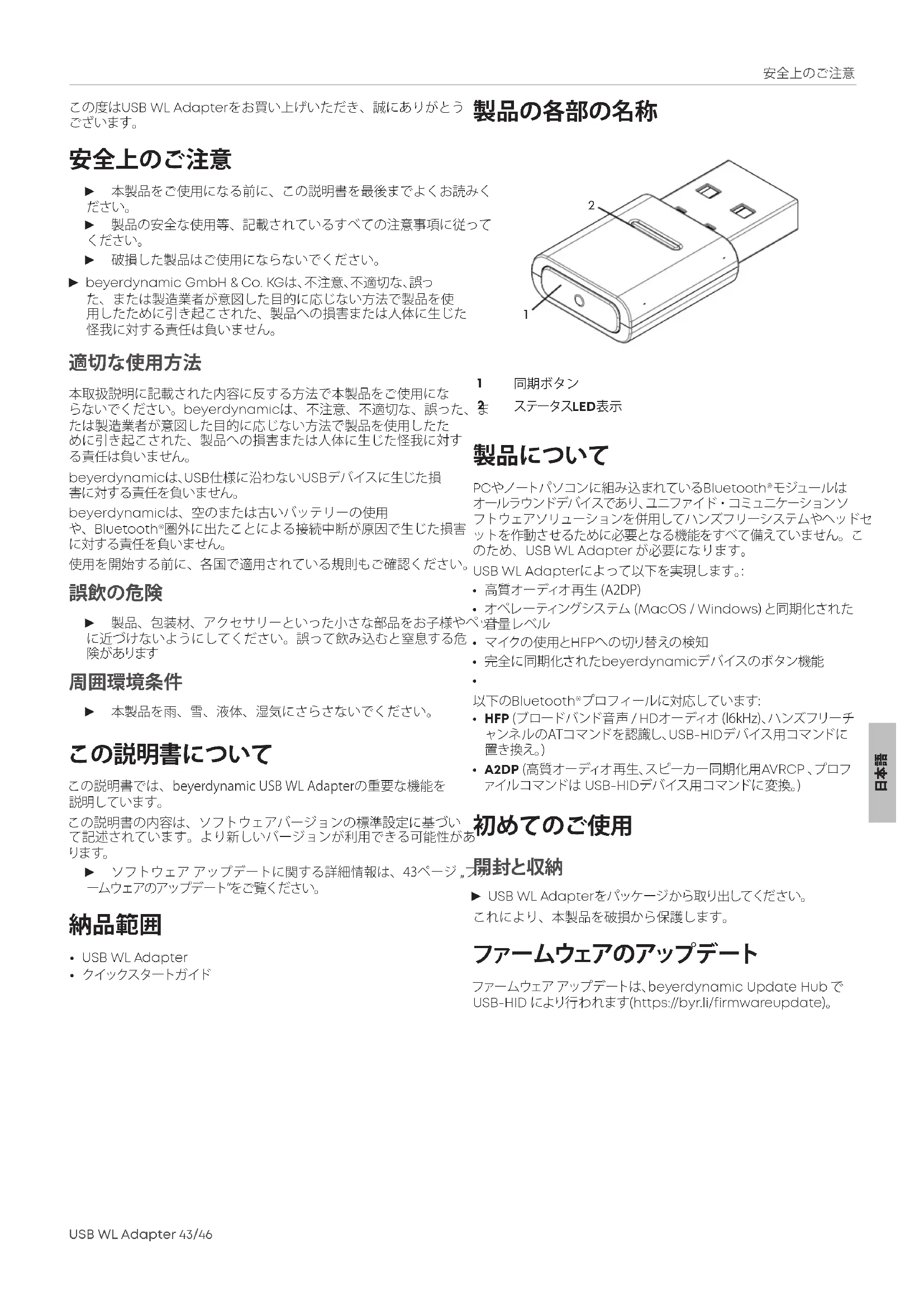 安全上のご注意 .43 適切な使用方法 43 誤飲の危険 43 周囲環境条件 43 この説明書について.43 納品範囲 .43 製品の各部の名称.43 製品について.43 初めてのご使用.43 開封と収納 43 ファームウェアのアップデート .43 サポートされている音声コーデック .44 操作 .44 USB WL Adapterの差し込みと取り外し 44 USB WL Adapterを使用したbeyerdynamicのBluetooth®互換 製品とPC/ノートパソコンのBluetooth®接続(ペアリング) 44 LED表示のリスト 44 USB WL Adapterが対応している機能 44 トラブルシューティング./.FAQ.44 お手入れ .45 廃棄 .45 EU適合宣言.46 技術データ.46 保証 .46 商標 .46安全上のご注意 USB WL Adapter 43/46 この度はUSB WL Adapterをお買い上げいただき、誠にありがとう