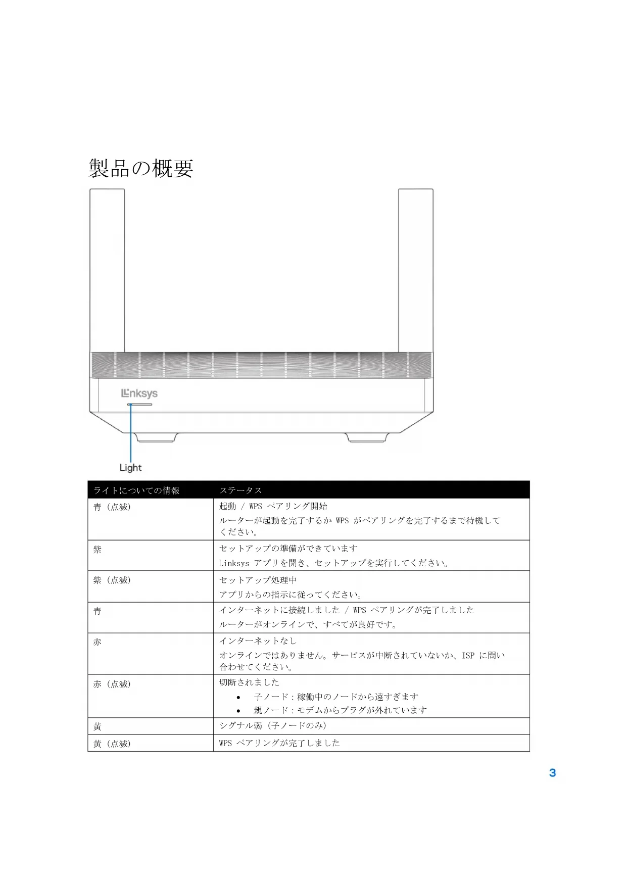 規則、保証、安全情報についての情報は、Linksys.com/support/MR2000 をご覧ください。 仕様は予告なしに変更されることがあります。最大パフォーマンスは IEEE 標準 802.11 仕様を由来とします。ワイヤレスネットワーク、データスル ープットレートや範囲、カバーの能力が低い場合には、実際のパフォーマンスは異なる場合がありま す。パフォーマンスは、アクセスポイントからの距離、ネットワークのトラフィック量、建物の建築資 材および建設状況、使用されているオペレーティングシステム、混在して使用されるワイヤレス製品、 干渉およびその他の悪条件を含む多くの要因、条件および変数に依存します。 受賞経験もあるテクニカルサポートについては、 Linksys.com/support/MR2000 をご覧ください。 Linksys、Intelligent Mesh、およびその他の多くの製品名ならびにロゴは、Linksys Holdings, Inc. および/またはその関連会社の商標です。記載されているサード パーティの商標は、それぞれの所有者