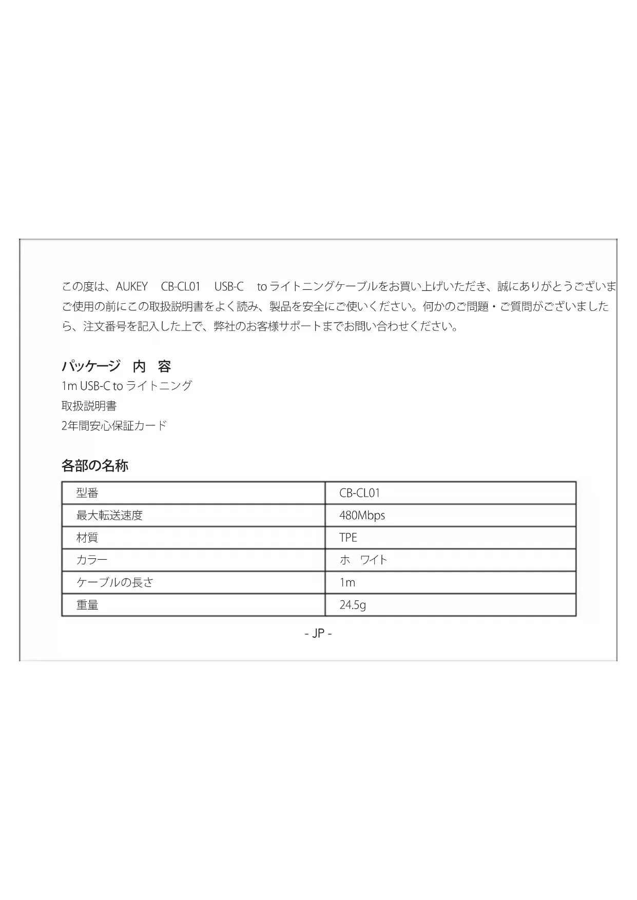 24.5g- JP - 保証とアフターサービス 製品について、何のご問題・ご質問などがございましたら、ご注文番号を記入した上で、下記のメールアドレ スまでお問い合わせください。最も早い営業日にご返信を差し上げます。 Eメール:support.jp@aukey.com *当社は、AUKEY公式ショップまたは当社が認める小売業者から購入された製品のみに対して、アフターサービスと製品保 証を提供しております。他の小売業者から購入された製品の交換、返品、返金に関しましては購入先へお問い合わせ下さい。Model: CB-CL01 AUKEY International Ltd. www.aukey.com | support@aukey.com No.102, Building P09, Electronics Trade Center Huanan City, Pinghu Town, Longgang District Shenzhen, Guangdong, 518111, CN