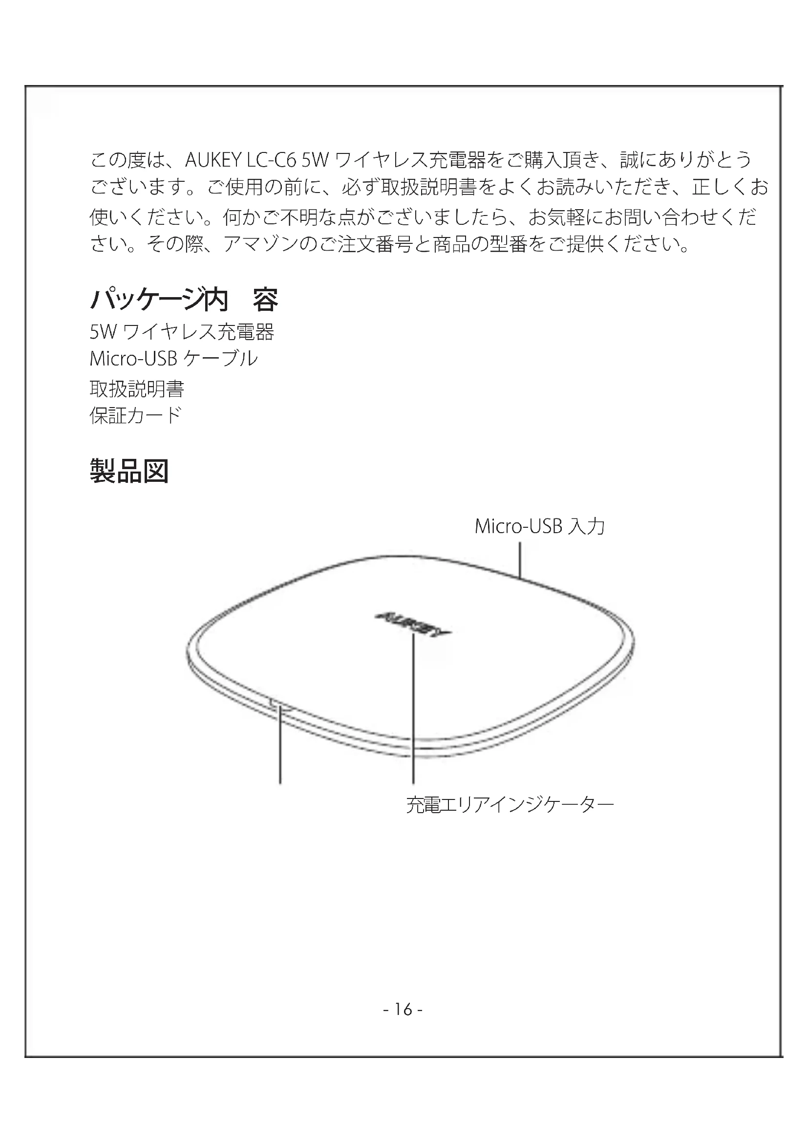 Manutenzione del prodotto Indicatore Verde Rosso Rosso lampeggiante Status In carica / completamente carico Standby Errore di carica Indicatore a LED- 16 - この度は、AUKEYLC-C65Wワイヤレス充電器をご購入頂き、誠にありがとう ございます。ご使用の前に、必ず取扱説明書をよくお読みいただき、正しくお 使いください。何かご不明な点がございましたら、お気軽にお問い合わせくだ さい。その際、アマゾンのご注文番号と商品の型番をご提供ください。