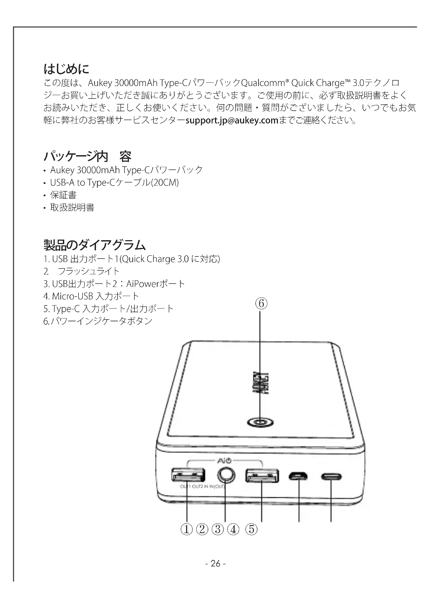 この度は、Aukey30000mAhType-CパワーバックQualcomm®QuickCharge™3.0テクノロ ジーお買い上げいただき誠にありがとうございます。ご使用の前に、必ず取扱説明書をよく お読みいただき、正しくお使いください。何の問題・質問がございましたら、いつでもお気 軽に弊社のお客様サービスセンターsupport.jp@aukey.comまでご連絡ください。