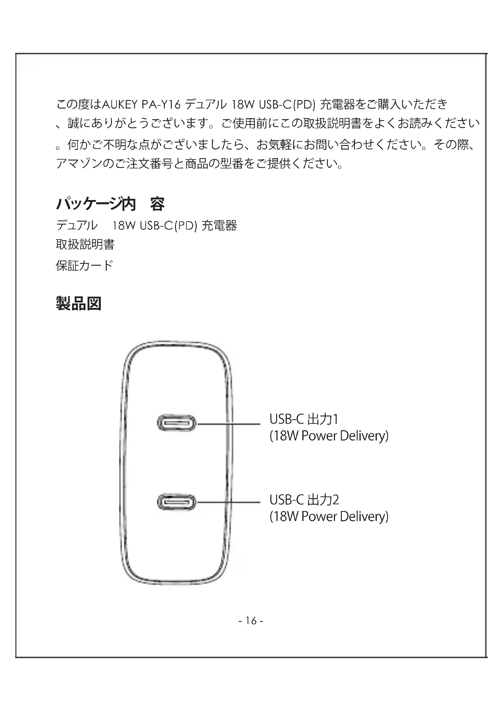 この度はAUKEY PA-Y16 デュアル 18W USB-C(PD) 充電器をご購入いただき