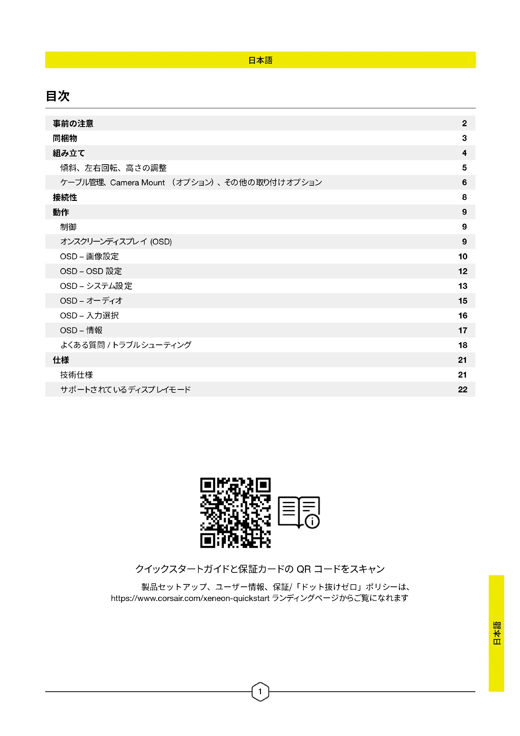 製品セットアップ、ユーザー情報、保証/「ドット抜けゼロ」ポリシーは、 https://www.corsair.com/xeneon-quickstart ランディングページからご覧になれます クイックスタートガ イドと保 証 カ ードの QR コ ードをスキャン2
