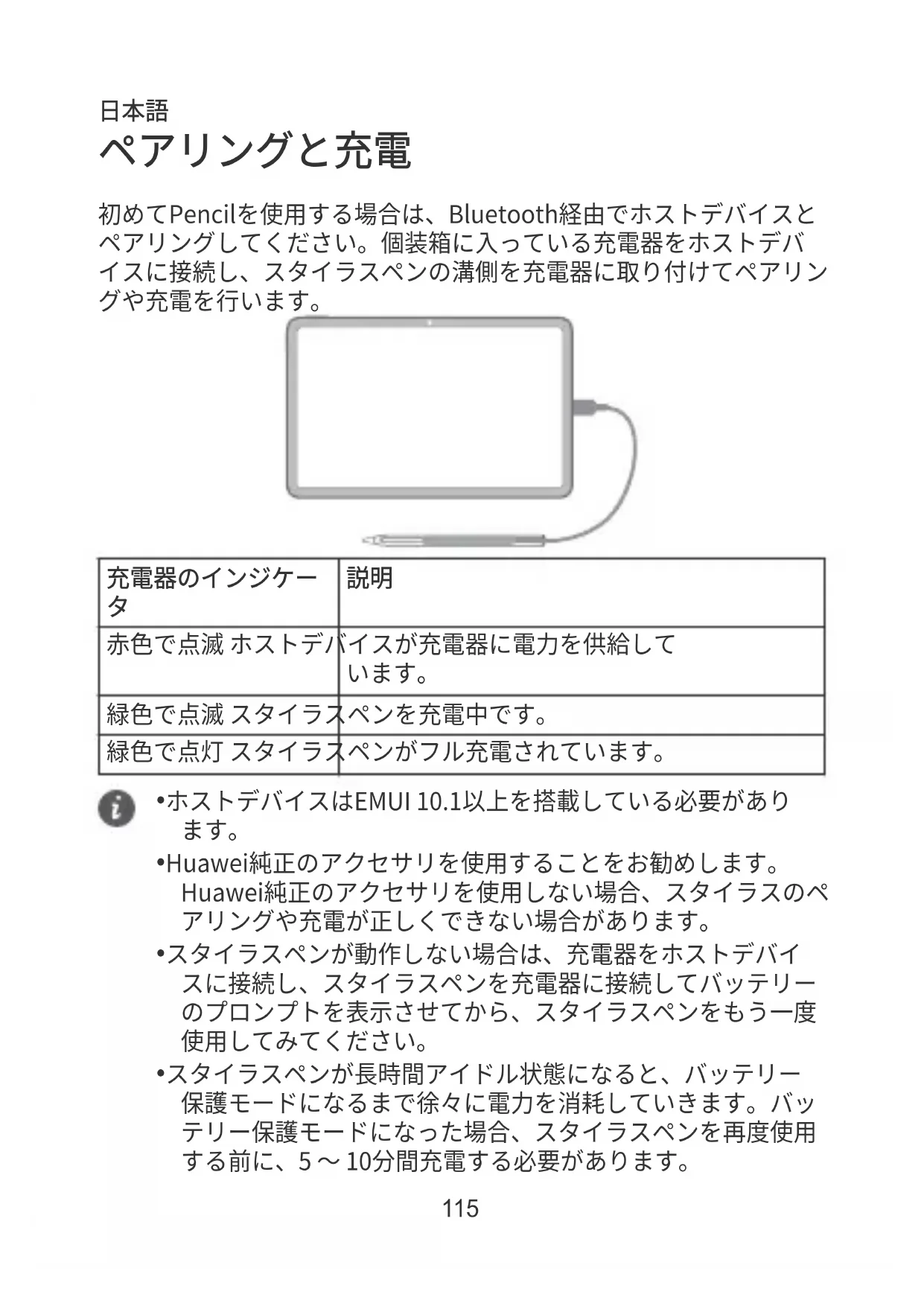 - Huawei純正のアクセサリを使用することをお勧めします。 Huawei純正のアクセサリを使用しない場合、スタイラスのペ アリングや充電が正しくできない場合があります。