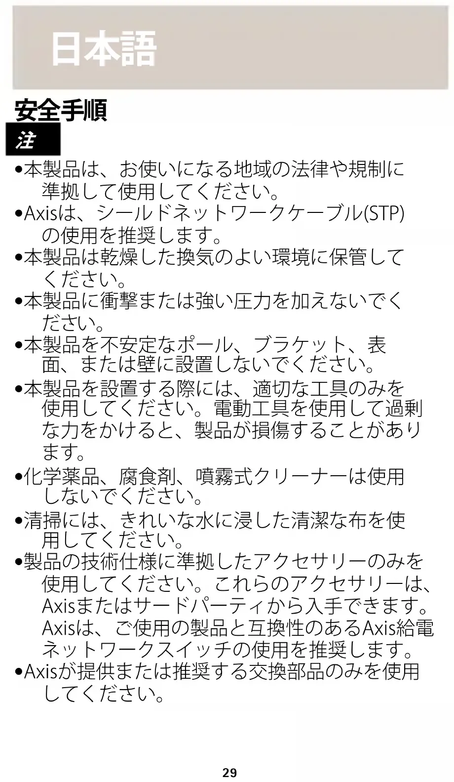 29•製品を⾃分で修理しないでください。修理に ついては、Axisサポートまたは販売代理店にお