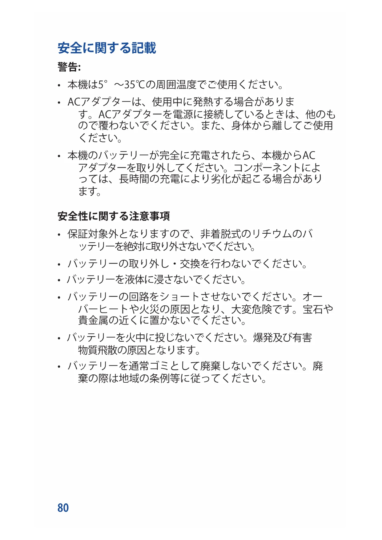 - バッテリーを通常ゴミとして廃棄しないでください。廃 棄の際は地域の条例等に従ってください。81