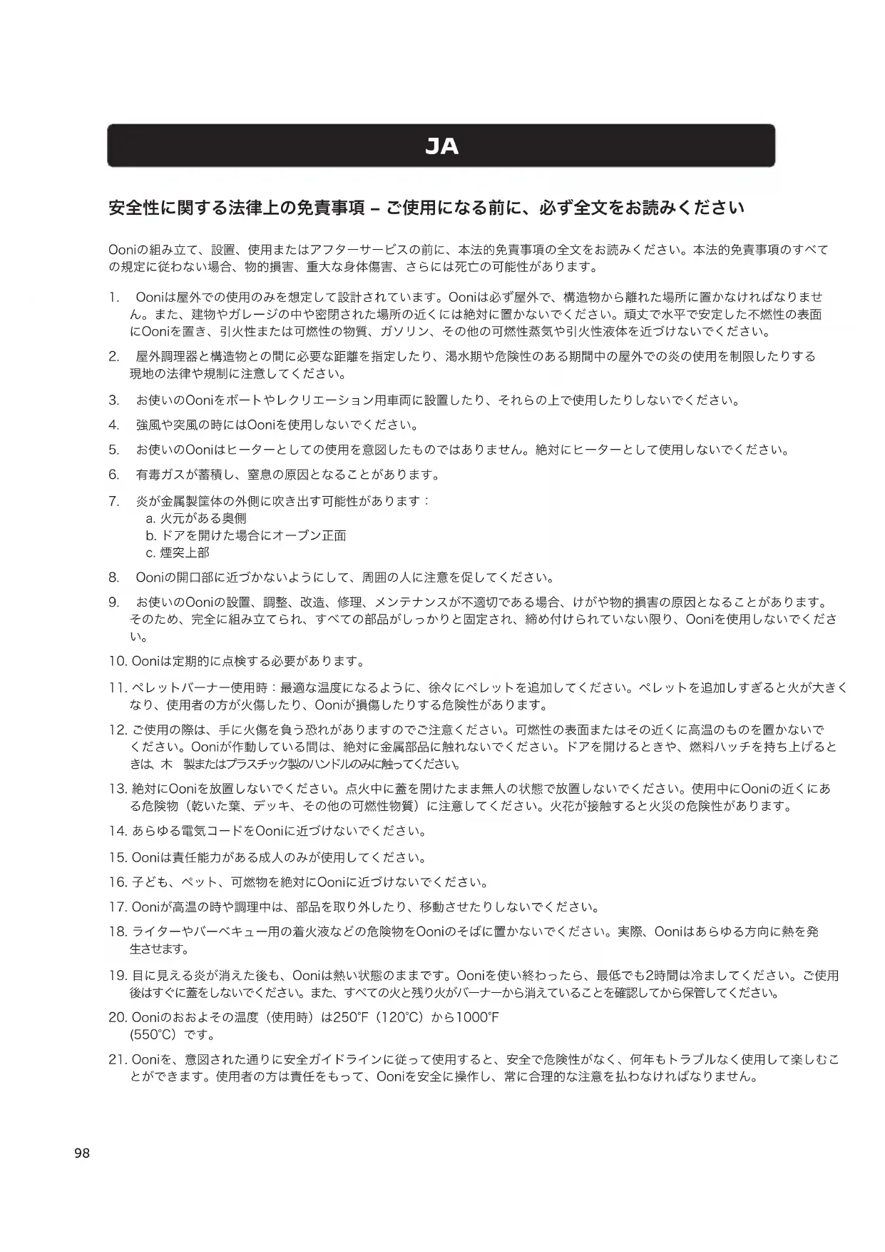 安全性に関する法律上の免責事項 – ご使用になる前に、必ず全文をお読みください Ooniの組み立て、設置、使用またはアフターサービスの前に、本法的免責事項の全文をお読みください。本法的免責事項のすべて の規定に従わない場合、物的損害、重大な身体傷害、さらには死亡の可能性があります。
