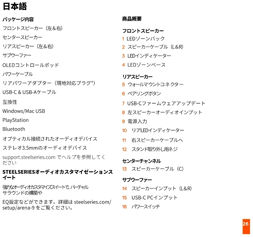 詳しい商品情報はこちらsteelseries.com/setup/28 arena-9 任意の接続 BLUETOOTH OLEDコントロールポッドで、システム設定 | BLUETOOTH | ペアリングを選択してBluetoothが有 効化されているデバイスとペアリングします。 ご注意ください:Bluetoothオーディオは他のオーデ ィオ音源とミックスされます。LEDインディケーター (3) が青 になります。 ヘッドセットオーディオジャック ヘッドセットオーディオケーブルをOLEDコントロー ル ポッドの ヘッドセットオーディオジャック (25)に接 続します。スピーカーは自動的にミュートになり、お 使 い の ヘ ッ ド セ ッ ト オ ー デ ィ オ の 電 源 が 入 り ま す 。ス ピーカーの電源を再びオンにするには、OLEDコント ロ ール ポッド マルチファンクションボタン(ミュート/ ヘッドセットの切り替え/戻る) (26)を押 してくだ さ い。Arena 9は有線ヘッドセットマイクの使用をサポー トしています。WindowsでArena 9がレコーディング デバイスであることを確認してください。 PLAYSTATIONのサポート ご注意ください:PlayStationは2.1ステレオのみをプ レイバックし、USBおよびオプティカル接続を介した 5.1サラウンドはプレイバックしません。PlayStation ですべてのスピーカーを使用するには、5.1 Upmix機 能 を使 用 してくだ さい 。 AUX オー ディオインプット 3.5mmオーディオケーブルを、オーディオデバイス からArena 9サブウーファーの補助入力 (22) に接