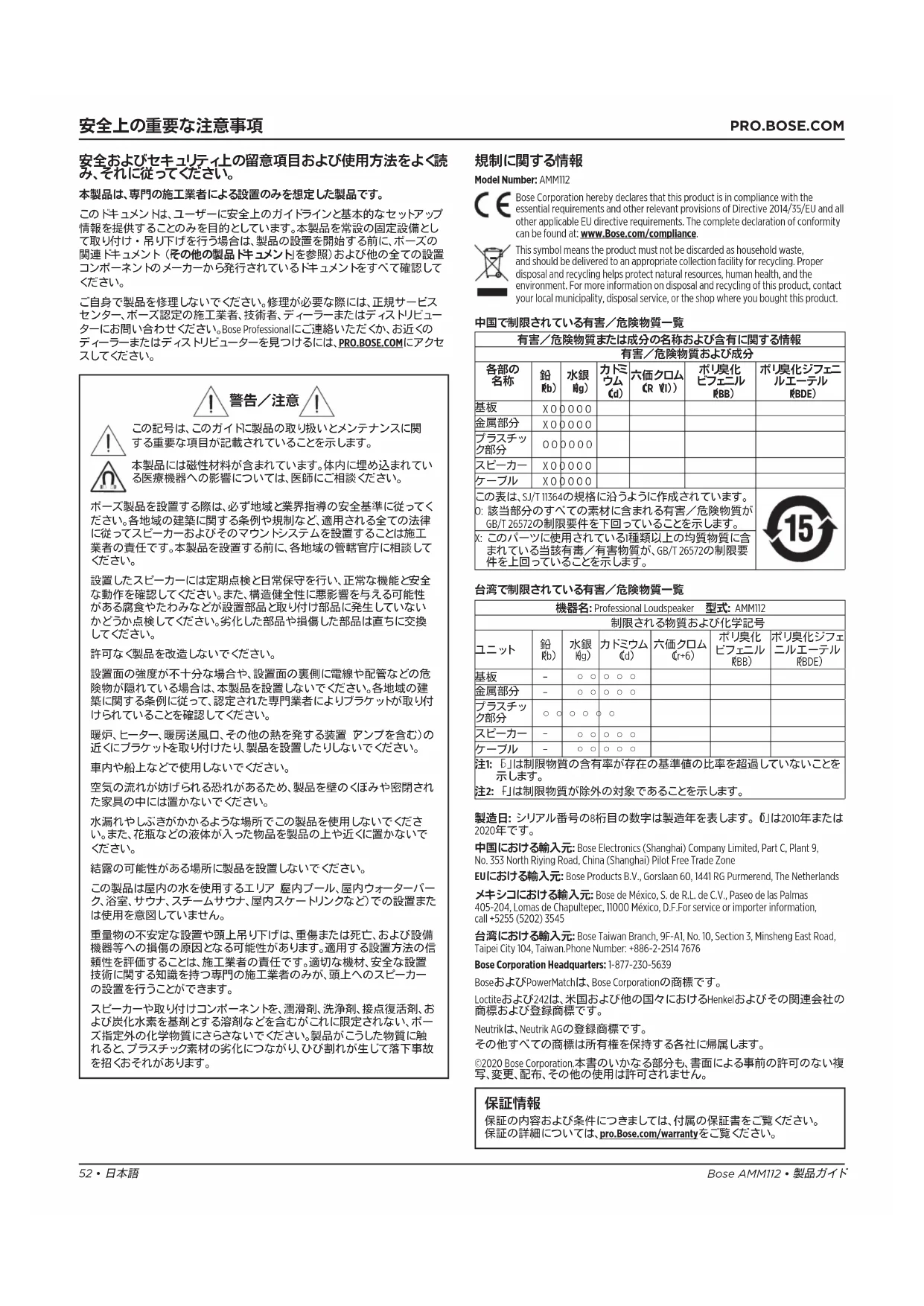 結露の可能性がある場所に製品を設置しないでください。 この製品は屋内の水を使用するエリア(屋内プール、屋内ウォーターパー ク、浴室、サウナ、スチームサウナ、屋内スケートリンクなど)での設置また は使用を意図していません。 重量物の不安定な設置や頭上吊り下げは、重傷または死亡、および設備 機器等への損傷の原因となる可能性があります。適用する設置方法の信 頼性を評価することは、施工業者の責任です。適切な機材、安全な設置 技術に関する知識を持つ専門の施工業者のみが、頭上へのスピーカー の設置を行うことができます。 スピーカーや取り付けコンポーネントを、潤滑剤、洗浄剤、接点復活剤、お よび炭化水素を基剤とする溶剤などを含むがこれに限定されない、ボー ズ指定外の化学物質にさらさないでください。製品がこうした物質に触 れると、プラスチック素材の劣化につながり、ひび割れが生じて落下事故 を招くおそれがあります。日本語