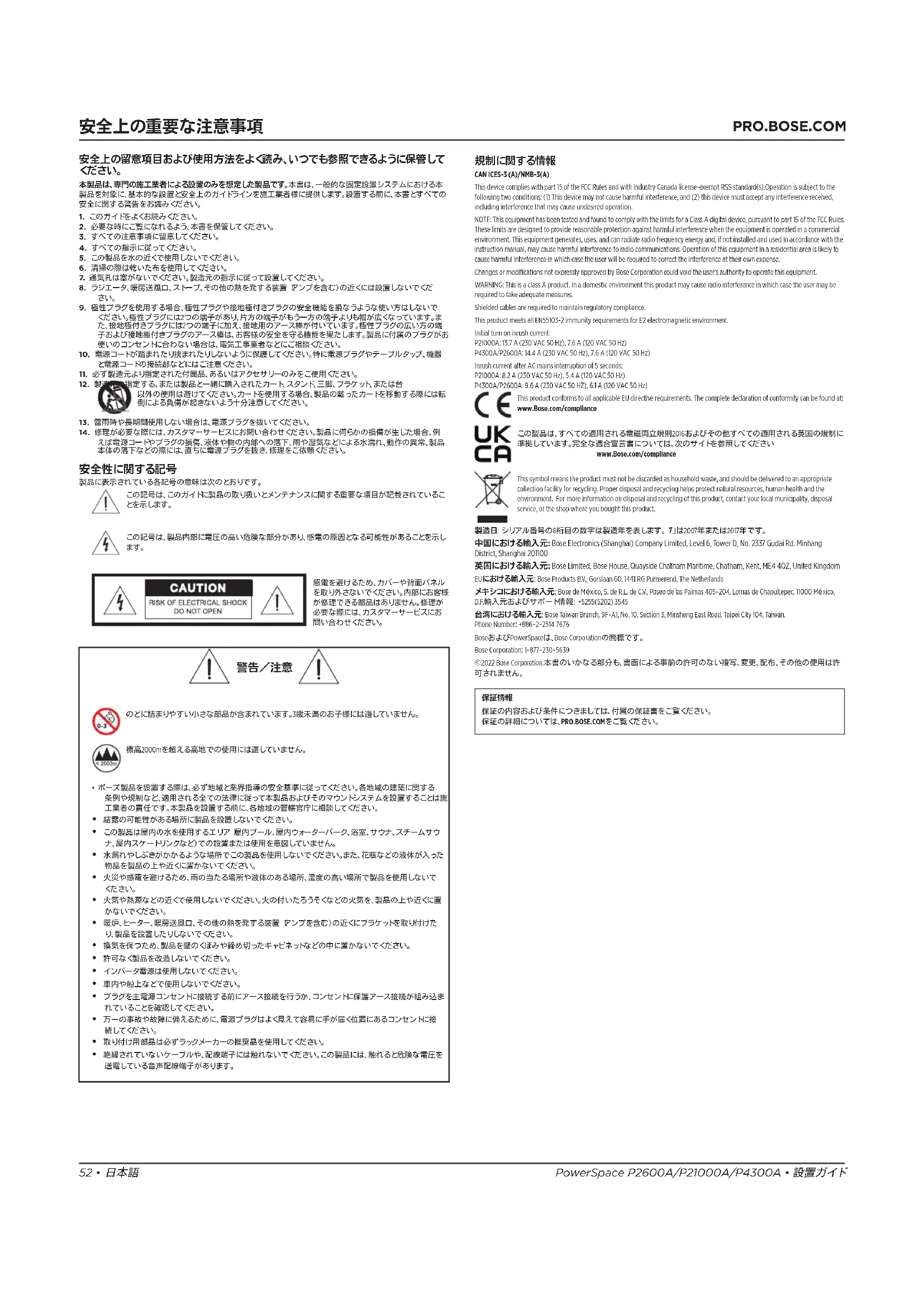 本製品は、専門の施工業者による設置のみを想定した製品です。本書は、一般的な固定設置システムにおける本製品を対象に、基本的な設置と安全上のガイドラインを施工業者様に提供します。設置する前に、本書とすべての安全に関する警告をお読みください。1. このガイドをよくお読みください。2. 必要な時にご覧になれるよう、本書を保管してください。3. すべての注意事項に留意してください。4. すべての指示に従ってください。5. この製品を水の近くで使用しないでください。6. 清掃の際は乾いた布を使用してください。7. 通気孔は塞がないでください。製造元の指示に従って設置してください。8. ラジエータ、暖房送風口、ストーブ、その他の熱を発する装置(アンプを含む)の近くには設置しないでくだ 9. 極性プラグを使用する場合、極性プラグや接地極付きプラグの安全機能を損なうような使い方はしないでください。極性プラグには2つの端子があり、片方の端子がもう一方の端子よりも幅が広くなっています。また、接地極付きプラグには2つの端子に加え、接地用のアース棒が付いています。極性プラグの広い方の端子および接地極付きプラグのアース棒は、お客様の安全を守る機能を果たします。製品に付属のプラグがお使いのコンセントに合わない場合は、電気工事業者などにご相談ください。10. 電源コードが踏まれたり挟まれたりしないように保護してください。特に電源プラグやテーブルタップ、機器と電源コードの接続部などにはご注意ください。11. 必ず製造元より指定された付属品、あるいはアクセサリーのみをご使用ください。12. 製造元の指定する、または製品と一緒に購入されたカート、スタンド、三脚、ブラケット、または台以外の使用は避けてください。カートを使用する場合、製品の載ったカートを移動する際には転倒による負傷が起きないよう十分注意してください。 13. 雷雨時や長期間使用しない場合は、電源プラグを抜いてください。14. 修理が必要な際には、カスタマーサービスにお問い合わせください。製品に何らかの損傷が生じた場合、例えば電源コードやプラグの損傷、液体や物の内部への落下、雨や湿気などによる水濡れ、動作の異常、製品本体の落下などの際には、直ちに電源プラグを抜き、修理をご依頼ください。 CAN ICES-3 (A)/NMB-3(A) This device complies with part 15 of the FCC Rules and with Industry Canada license-exempt RSS standard(s).Operation is subject to the following two conditions: (1) This device may not cause harmful interference, and (2) this device must accept any interference received, including interference that may cause undesired operation. NOTE: This equipment has been tested and found to comply with the limits for a Class A digital device, pursuant to part 15 of the FCC Rules. These limits are designed to provide reasonable protection against harmful interference when the equipment is operated in a commercial environment. This equipment generates, uses, and can radiate radio frequency energy and, if not installed and used in accordance with the instruction manual, may cause harmful interference to radio communications. Operation of this equipment in a residential area is likely to cause harmful interference in which case the user will be required to correct the interference at their own expense. Changes or modifications not expressly approved by Bose Corporation could void the user's authority to operate this equipment. WARNING: This is a class A product. In a domestic environment this product may cause radio interference in which case the user may be required to take adequate measures.Shielded cables are required to maintain regulatory compliance.This product meets all EN55103-2 immunity requirements for E2 electromagnetic environment.Initial turn on inrush current: P21000A: 13.7 A (230 VAC 50 Hz), 7.6 A (120 VAC 50 Hz) P4300A/P2600A: 14.4 A (230 VAC 50 Hz), 7.6 A (120 VAC 50 Hz)Inrush current after AC mains interruption of 5 seconds: P21000A: 8.2 A (230 VAC 50 Hz), 5.4 A (120 VAC 50 Hz) P4300A/P2600A: 9.6 A (230 VAC 50 HZ), 6.1 A (120 VAC 50 Hz) This product conforms to all applicable EU directive requirements. The complete declaration of conformity can be found at: www.Bose.com/complianceこの製品は、すべての適用される電磁両立規則2016およびその他すべての適用される英国の規制に準拠しています。完全な適合宣言書については、次のサイトを参照してください www.Bose.com/compliancewww.Bose.com/complianceThis symbol means the product must not be discarded as household waste, and should be delivered to an appropriate collection facility for recycling. Proper disposal and recycling helps protect natural resources, human health and the environment. For more information on disposal and recycling of this product, contact your local municipality, disposal service, or the shop where you bought this product. 製造日: シリアル番号の8桁目の数字は製造年を表します。「7」は2007年または2017年です。 中国における輸入元: Bose Electronics (Shanghai) Company Limited, Level 6, Tower D, No. 2337 Gudai Rd. Minhang District, Shanghai 201100 英国における輸入元: Bose Limited, Bose House, Quayside Chatham Maritime, Chatham, Kent, ME4 4QZ, United Kingdom EUにおける輸入元: Bose Products B.V., Gorslaan 60, 1441 RG Purmerend, The Netherlands メキシコにおける輸入元: Bose de México, S. de R.L. de C.V., Paseo de las 