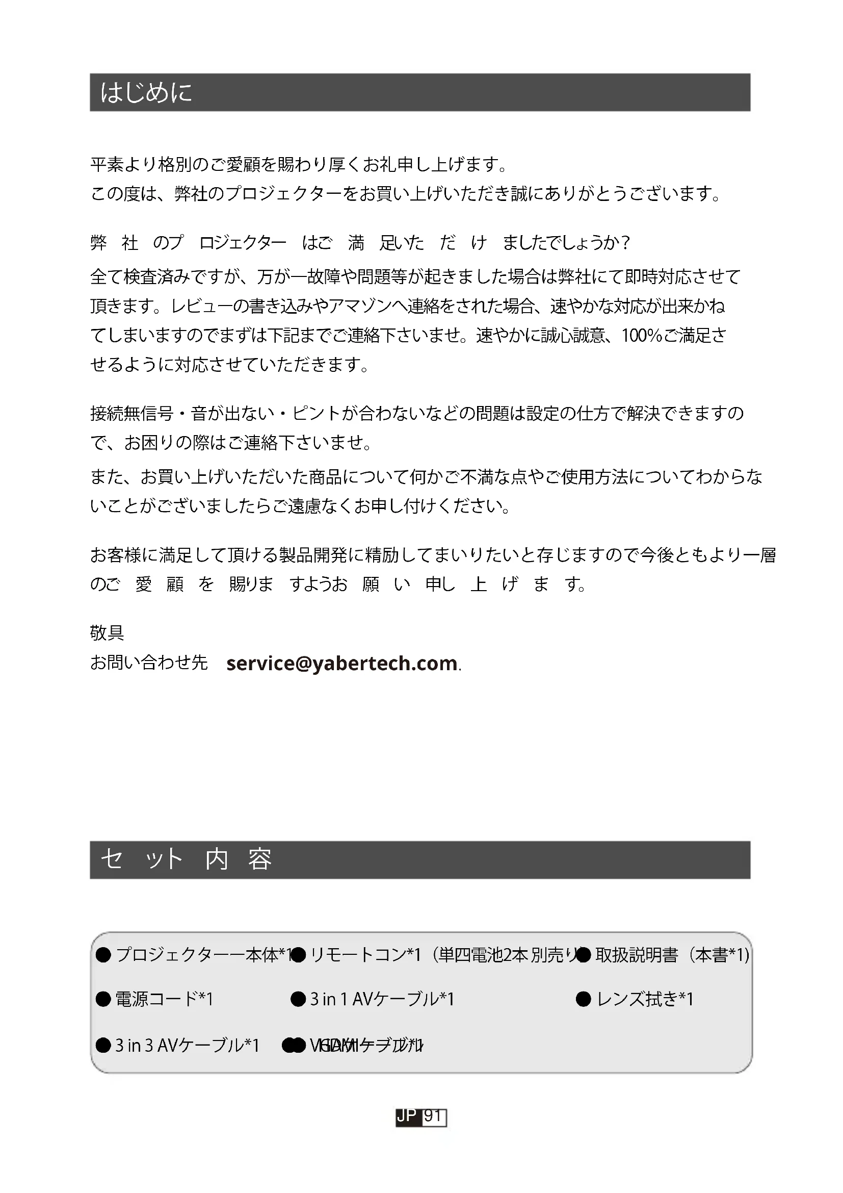 ●3in1AVケーブル*1 ●リモートコン*1(単四電池2本別売り) ●3in3AVケーブル*1 ● HDMIケーブル ●電源コード*1 ●レンズ拭き*1 ●プロジェクターー本体*1 ●取扱説明書(本書*1) ●VGAケーブル*1 平素より格別のご愛顧を賜わり厚くお礼申し上げます。 この度は、弊社のプロジェクターをお買い上げいただき誠にありがとうございます。 弊 社 のプ ロジェクター はご 満 足いた だ け ましたでしょうか? 全て検査済みですが、万が一故障や問題等が起きました場合は弊社にて即時対応させて 頂きます。レビューの書き込みやアマゾンへ連絡をされた場合、速やかな対応が出来かね てしまいますのでまずは下記までご連絡下さいませ。速やかに誠心誠意、100%ご満足さ せるように対応させていただきます。 接続無信号・音が出ない・ピントが合わないなどの問題は設定の仕方で解決できますの で、お困りの際はご連絡下さいませ。 また、お買い上げいただいた商品について何かご不満な点やご使用方法についてわからな いことがございましたらご遠慮なくお申し付けください。 お客様に満足して頂ける製品開発に精励してまいりたいと存じますので今後ともより一層 のご 愛 顧 を 賜りま すようお 願 い 申し 上 げ ま す。
