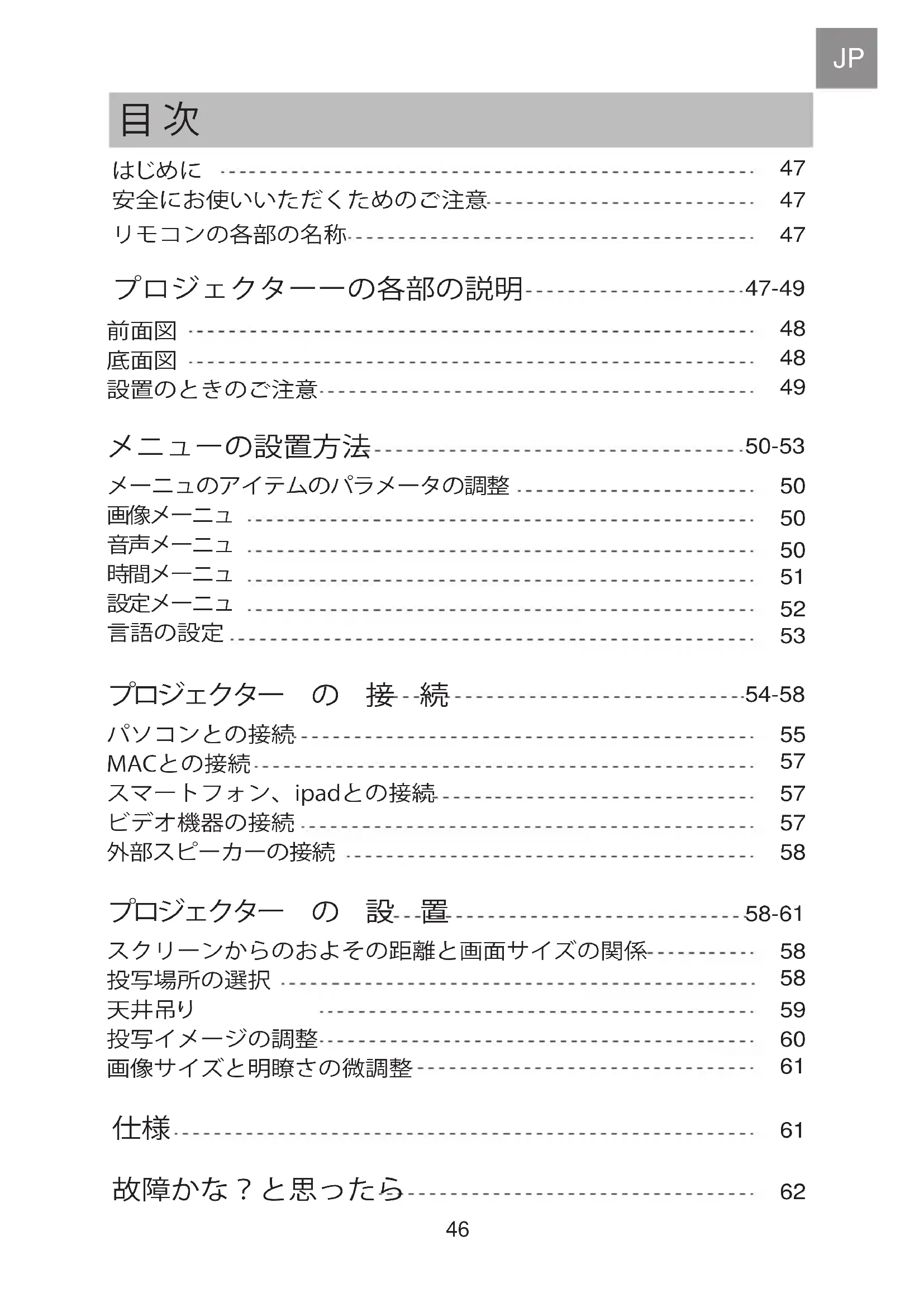 61 62 63はじめに このたびは、YABERY30プロジェクターーをお買い上げいただき誠にありがとうございました。 ご使用前にこの取扱説明書をよく読みください。また、お手元に置き、いつでも確認できるよう にしておいてください。 万一ご使用中何がございましたら、遠慮なく service@yabertech.com