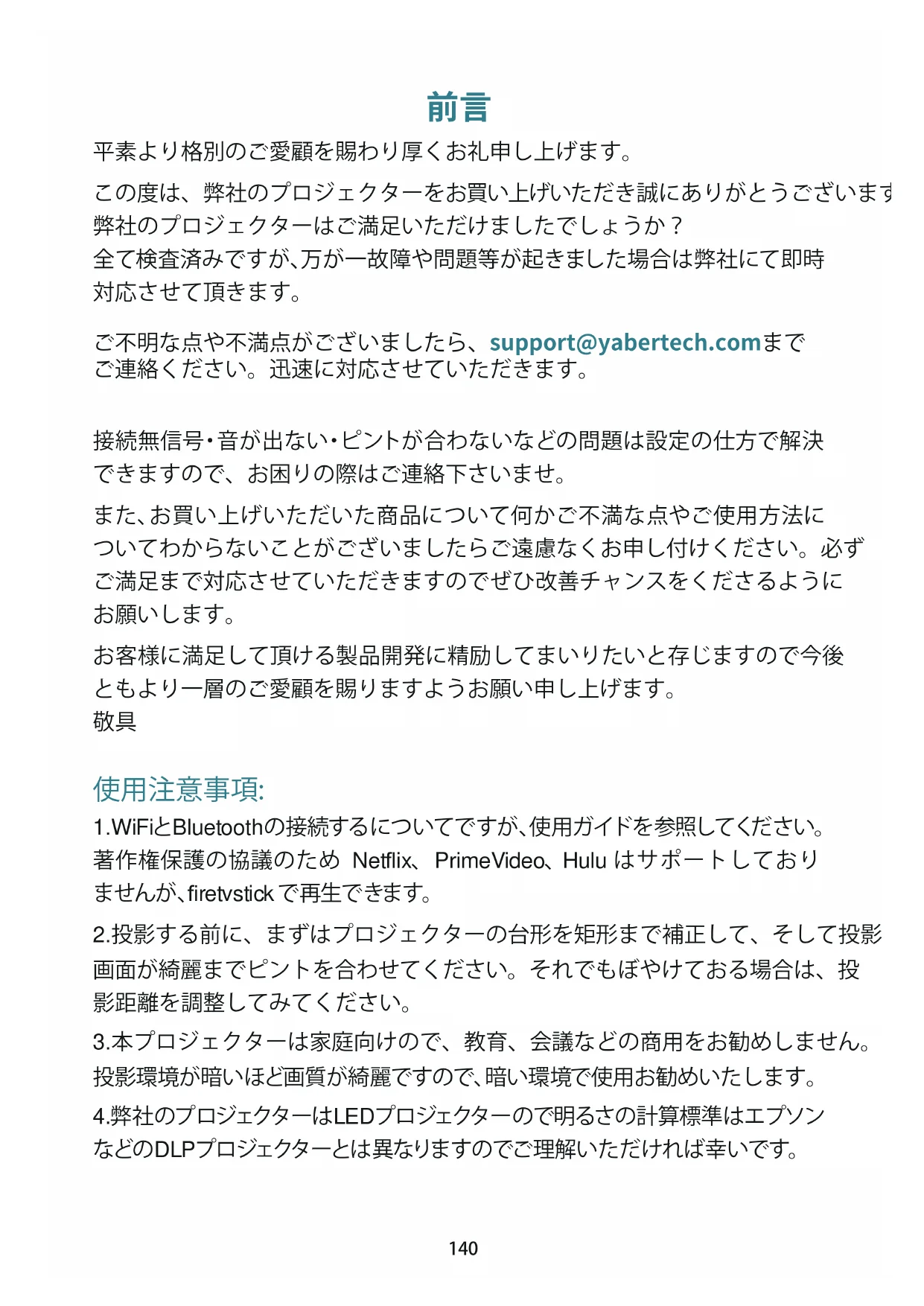 平素より格別のご愛顧を賜わり厚くお礼申し上げます。 この度は、弊社のプロジェクターをお買い上げいただき誠にありがとうございます。 弊社のプロジェクターはご満足いただけましたでしょうか? 全て検査済みですが、万が一故障や問題等が起きました場合は弊社にて即時