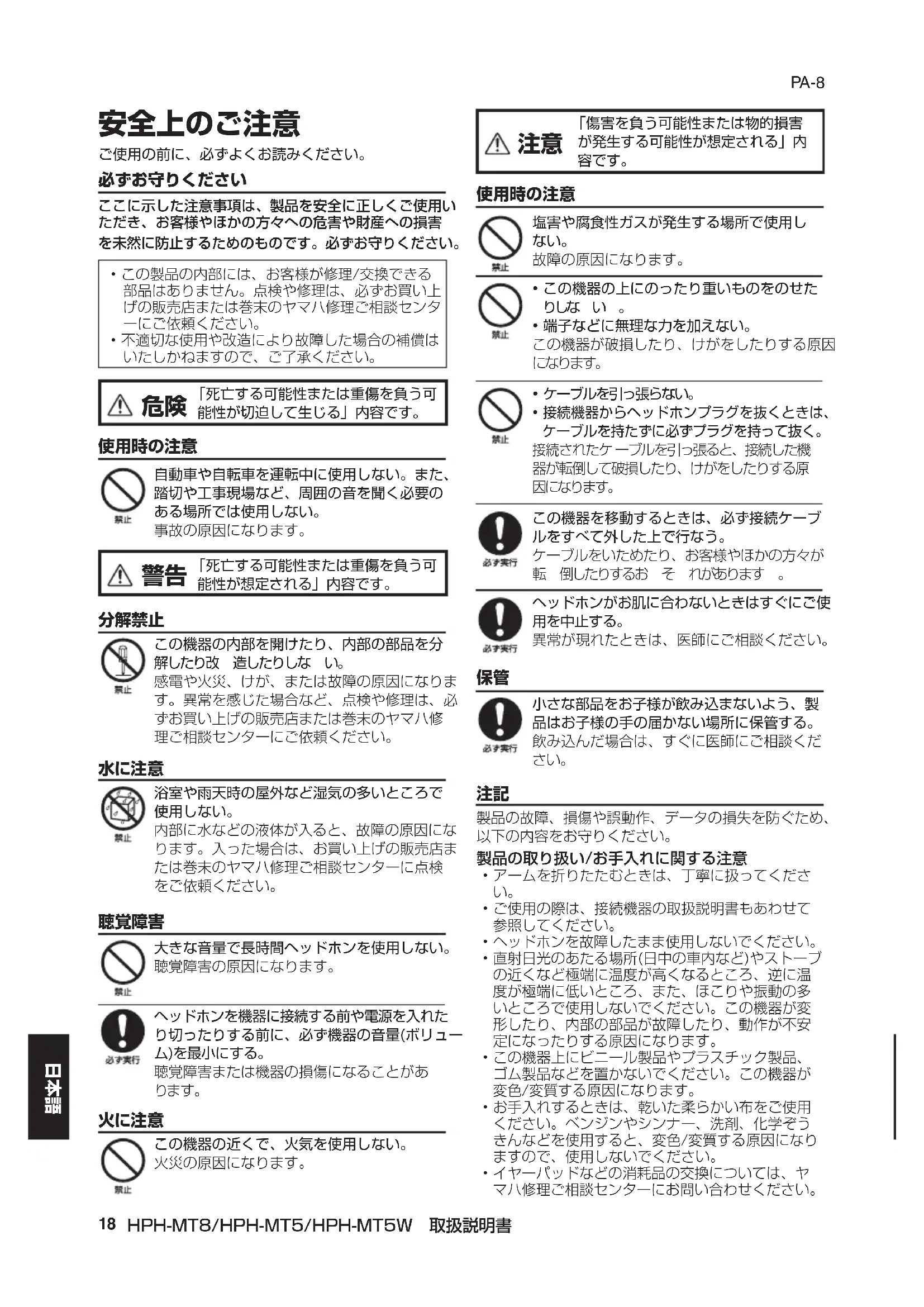 - ご使用の際は、接続機器の取扱説明書もあわせて参照してください。•ヘッドホンを故障したまま使用しないでください。•直射日光のあたる場所(日中の車内など)やストーブの近くなど極端に温度が高くなるところ、逆に温度が極端に低いところ、また、ほこりや振動の多いところで使用しないでください。この機器が変形したり、内部の部品が故障したり、動作が不安定になったりする原因になります。•この機器上にビニール製品やプラスチック製品、ゴム製品などを置かないでください。この機器が変色/変質する原因になります。•お手入れするときは、乾いた柔らかい布をご使用ください。ベンジンやシンナー、洗剤、化学ぞうきんなどを使用すると、変色/変質する原因になりますので、使用しないでください。•イヤーパッドなどの消耗品の交換については、ヤマハ修理ご相談センターにお問い合わせください。 PA-8日本語