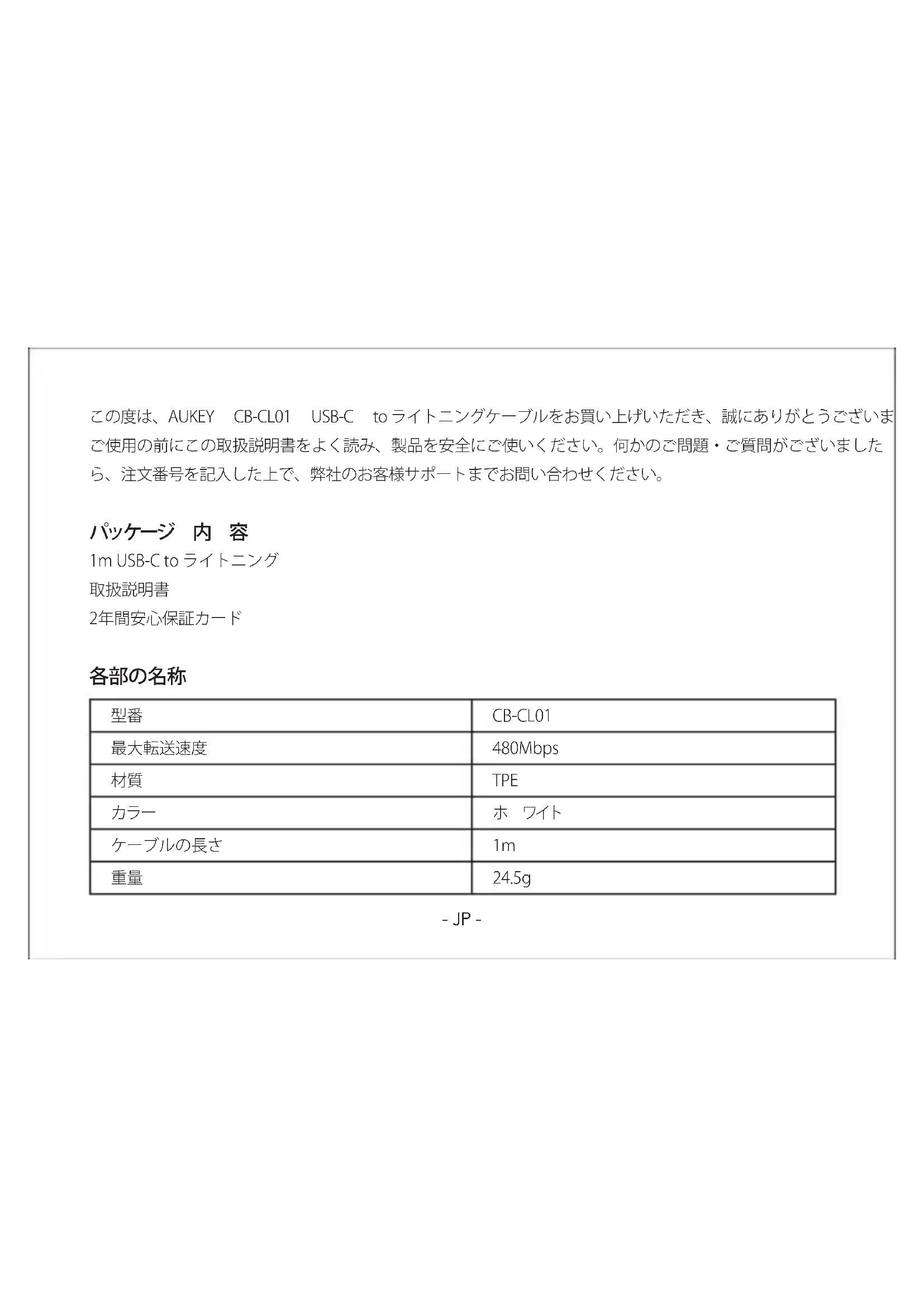 24.5g- JP - 保証とアフターサービス 製品について、何のご問題・ご質問などがございましたら、ご注文番号を記入した上で、下記のメールアドレ スまでお問い合わせください。最も早い営業日にご返信を差し上げます。 Eメール:support.jp@aukey.com *当社は、AUKEY公式ショップまたは当社が認める小売業者から購入された製品のみに対して、アフターサービスと製品保 証を提供しております。他の小売業者から購入された製品の交換、返品、返金に関しましては購入先へお問い合わせ下さい。Model: CB-CL01 AUKEY International Ltd. www.aukey.com | support@aukey.com No.102, Building P09, Electronics Trade Center Huanan City, Pinghu Town, Longgang District Shenzhen, Guangdong, 518111, CN