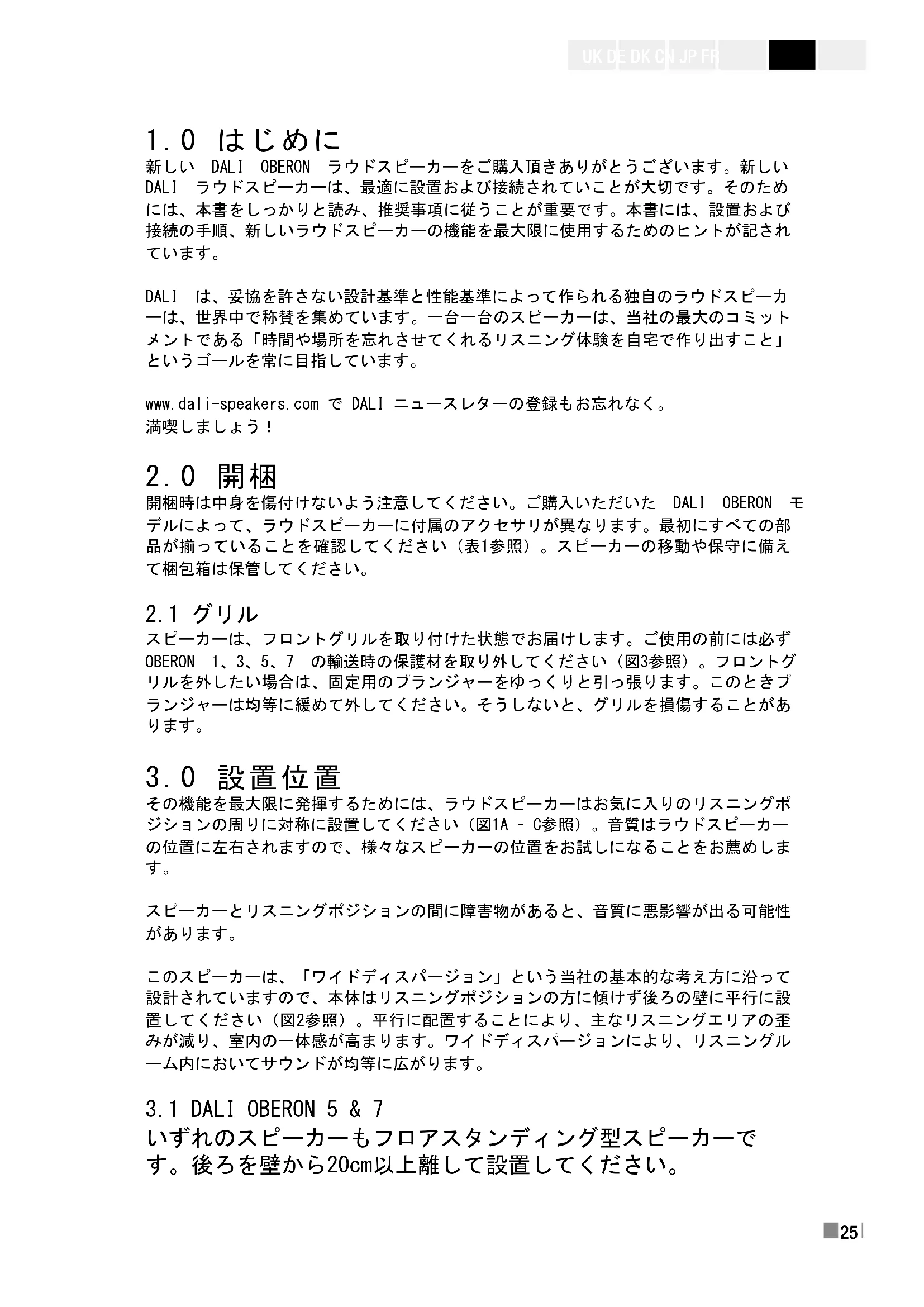 新しい DALI OBERON ラウドスピーカーをご購入頂きありがとうございます。新しい DALI ラウドスピーカーは、最適に設置および接続されていことが大切です。そのため には、本書をしっかりと読み、推奨事項に従うことが重要です。本書には、設置および 接続の手順、新しいラウドスピーカーの機能を最大限に使用するためのヒントが記され