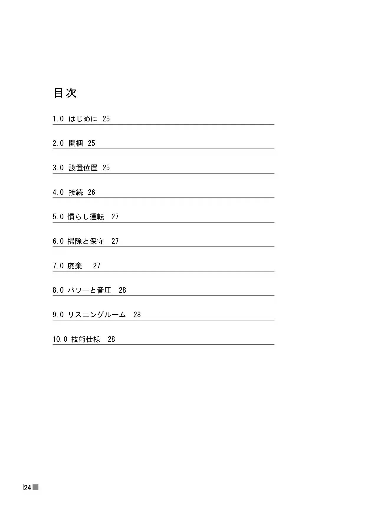 機械システムと同様に、ラウドスピーカーもスピーカーも最高の状態で動作するには「 ならし運転」期間が必要です。使い始めの時期は、音質のゆるやかな向上を体験しま す。慣らし運転期間は使用方法と再生音量によって異なります。最大性能に達するまで の再生は最長100時間を見込んでください。また、他の機械とは異なり、スピーカーは 音楽を定期的に正常に再生すると寿命が延びます。