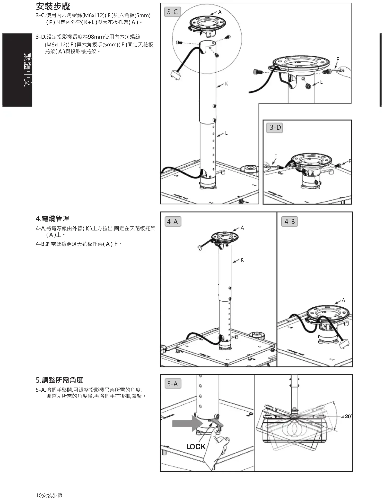 ( K+L )および天井マウントブラケットにオスコネクタ( A )を固定します。 3-D. プロジェクターの長さを 98 ミリメートルとして設定します。六角穴付ボルト(M6 x L12)( E )を使って、天井取り付けブラケット( A )とプロジェクターブラケットを取り付けます。5-A. ノブを緩めてヒンジモジュールの必須角度を調整します。調整後、後ろに押してノブを締め付けます