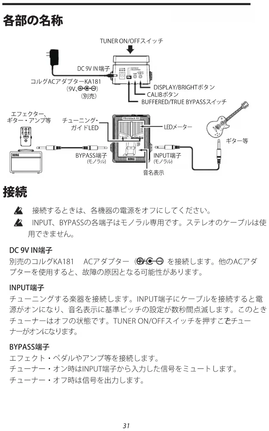 DC.9V.IN端子 別売のコルグKA181 ACアダプター(9V、 )を接続します。他のACアダ プターを使用すると、故障の原因となる可能性があります。 INPUT端子 チューニングする楽器を接続します。INPUT端子にケーブルを接続すると電 源がオンになり、音名表示に基準ピッチの設定が数秒間点滅します。このとき チューナーはオフの状態です。TUNERON/OFFスイッチを押すこと