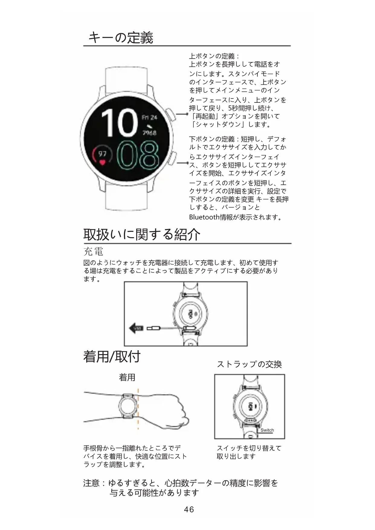 心臓ペースメーカーまたはその他の埋め込み型電子機器を装着して いる場合は、心拍ベルト を着用する前に医師に相談してください。 ウォッチの光学心拍センサーは緑色に点灯して点滅する。癲癇また は点滅する光源に敏感であれば、この製品を着用することができる か否かを医者に相談してください。 このデバイスは、センサーを介してあなたの毎日の活動を追跡しま す。これらのデーターは、歩数、睡眠、距離、心拍数とカロリデー ターなど、毎日の活動について説明することを目的と しているが、完全に正確というわけではありません。 このデバイス、付属品、心拍数センサーおよびその他の関連データ ーは、医療目的ではなく、娯楽目的やフィットネス目的のために設 計されており、病気や病症の診断、監視、治療または 予防に適用されません。心拍数データーは参考用であり、データー の偏差から生じる影響について、一切の責任を負うものではありま